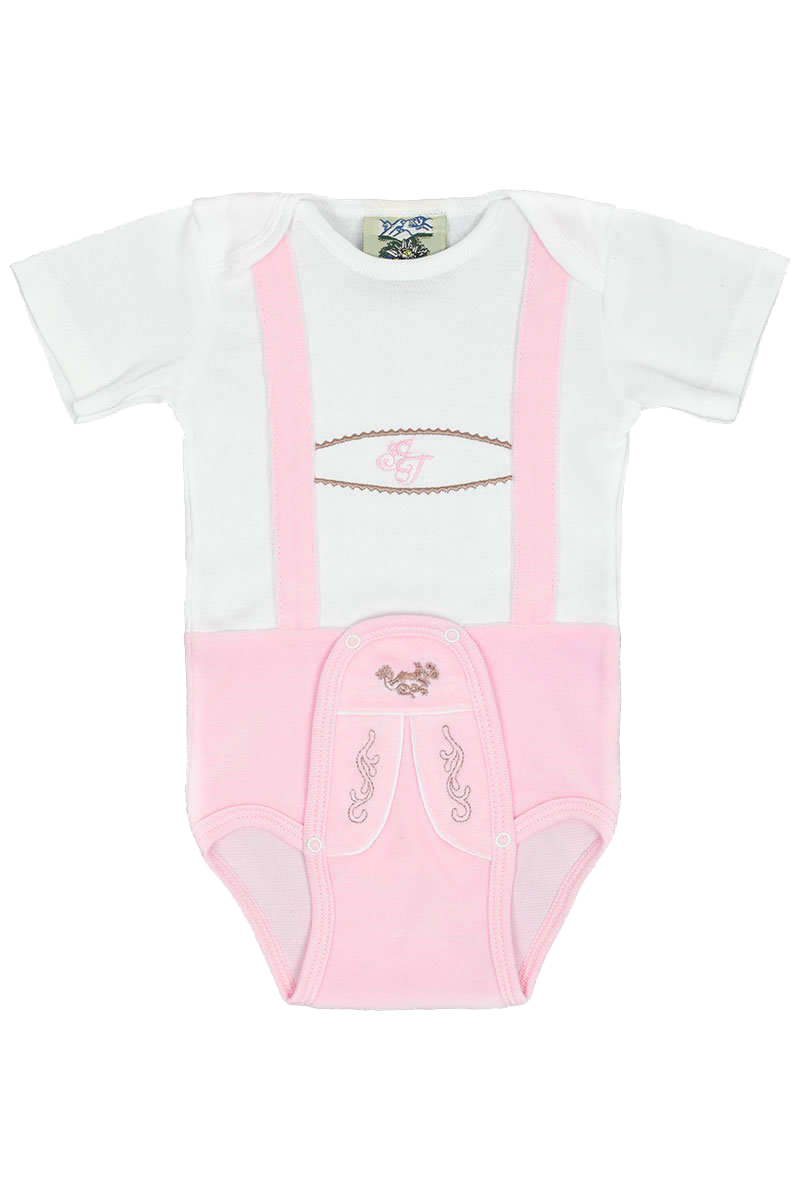 Dieser süße Trachtenstrampler besticht durch seine vielen liebevoll gestalteten Details. Der kurze Body hat die Optik einer kleinen rosanen Lederhose mit allem was zu einer echten Lederhose gehört. Die Träger sind in rosa gearbeitet, der Brustlatz ist aufgestickt und es sind die zwei Initialen von Isar Trachten „IT" in rosa eingestickt. Der Hosenteil des Bodys ist ebenfalls in rosa gehalten und mit Druckknöpfen zum einfachen öffnen versehen. Auf den Latz sind trachtige braune Stickereien angebracht.