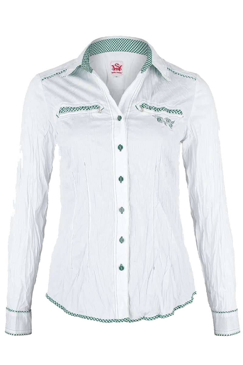 Diese süße und klassische weiße Bluse mit Crash-Effekt ist ein absolutes Basic und gehört in jeden Kleiderschrank. Sie ist leicht tailliert geschnitten und sitzt perfekt durch die Taillenabnäher und die Rückenpasse. Die Abschlüsse der Bluse, der Kragen und die Ärmelmanschetteninnenseite, sowie die Ärmeleinfassung sind mit grün-weiß kariertem Stoff eingefasst. Die Ellenbogenpatches sind auch aus grün-weiß kariertem Stoff gearbeitet. Die angedeuteten Brusttaschen der Bluse sind ebenfalls mit grün-weiß kariertem Stoff eingefasst und verfügen über kleine Anhänger aus Metall mit Glassteinen. Unterhalb der linken angedeuteten Brusttasche ist eine grüne Blumenstickerei angebracht. Hinten auf der Bluse ist nochmals eine grüne Blumenstickerei angebracht. Die Bluse verfügt über kleine grüne Knöpfe.