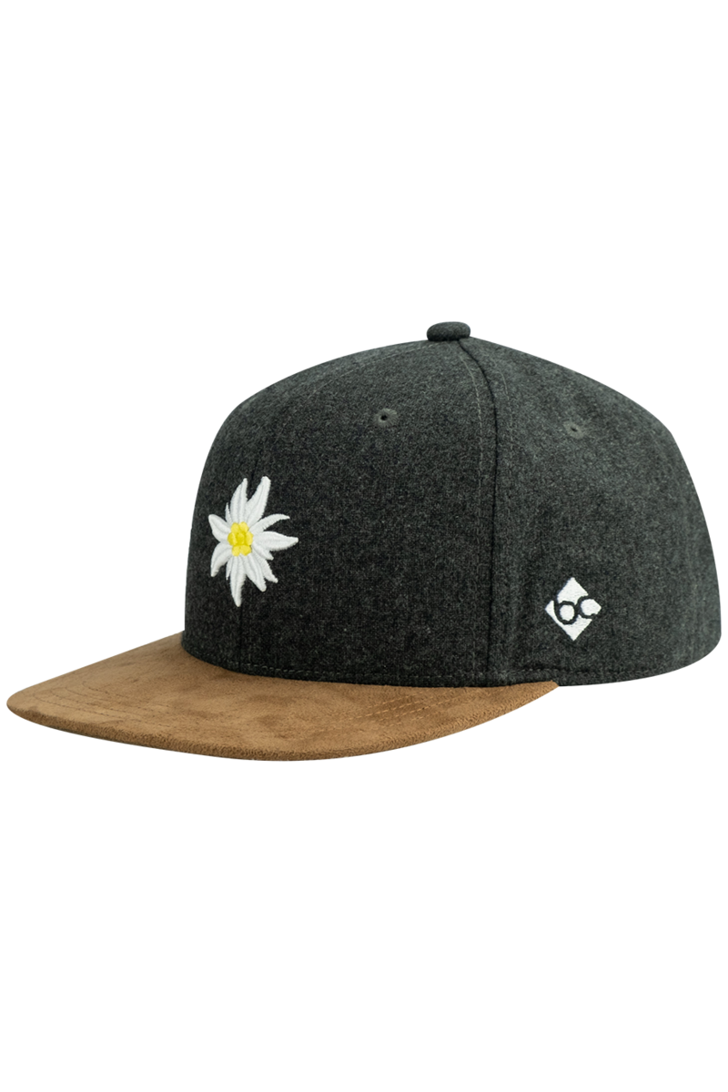 Die dunkelgraue Snapback Cap 'EDELWEIß KLASSIK-WILDLEDER' von Bavarian Caps ist genau das Richtige für alle die es rustikal lieben. Auf der Frontseite befindet sich ein weißes Edelweiß als 3D-Stickerei und der Schirm ist im braunen Wildlederimitat. Die Krone ist aus einem hochwertigem, leichtem Flanell-Stoff mit Wollanteil gefertigt. Der Verschluss ist mit Plastik-Snap zum Größen regulieren.Größe variabel, Umfang bei halbgeschlossenen Knöpfen ca. 58 cm.