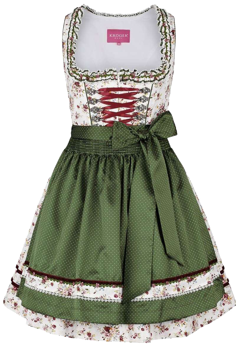 Dieses süße Dirndl ist ein absolutes Must-Have. Das Dirndl besteht aus weißem Stoff mit einem aufwendigen Muster aus kleinen Rosenarrangements. Die Abnäher am Oberteil und die Ärmelausschnitte sind in grünem Stoff mit weißen Punkten drauf abgesetzt. Rund um den Halsausschnitt verläuft eine aufwendige Rüschenbordüre aus dem Stoff des Dirndls die am Rand mit weißer Spitze geziert ist und mit zwei grünen Bändern versehen ist. Darunter befinden sich die aufwendigen Miederhacken die mit kleinen Glassteinen geschmückt sind. Die Zierschnürung besteht aus schillernden Bändern. Am Saum des Rockes sind zwei dunkelrote Zierstreifen angebracht. Die Schürze des Dirndls ist schlicht gestaltet und aus schillerndem, grünem Stoff mit weißen Punkten darauf gearbeitet. Unten am Saum sind mehrere Bordüren angebracht, dazu gehört eine weiße Spitzen Bordüre, ein roter Zierstreifen, eine Girlande aus kleinen Rosen und ein Streifen aus dem Stoff des Dirndl. Geschlossen wird das Dirndl vorne mit einem Reißverschluss. In den Rock des Dirndls sind zwei Einschubtaschen eingearbeitet. Die Rocklänge beträgt ca. 49 cm. Kombinieren Sie dieses freche Dirndl mit trachtigen Chucks und einer weißen Dirndlbluse. Vergessen Sie auch nicht einen Dirndl-BH. Denn erst ein spezieller Dirndl-BH unterstützt Ihr Dekolleté vorteilhaft und verschafft dem Dirndl einen guten Sitz. Wir empfehlen hierzu den Dirndl-BH 'Betty'.Dirndl-BH und eine Dirndlbluse sind nicht im Lieferumfang des Dirndls enthalten.