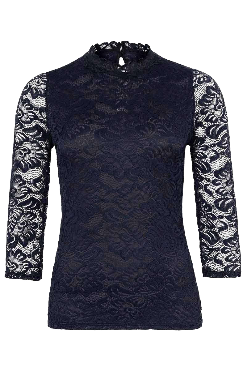 Das marineblaue Damenshirt von My Choice ist rundum aus edler Spitze mit Blütenmuster gefertigt, die am Body mit einem transparenten Futter unterlegt ist. Der hochgeschlossene Rundhalsausschnitt ist ebenfalls mit einem Spitzensaum eingefasst und wird am Rücken mit zwei Knöpfen geschlossen. Die ¾-Ärmel sind 44 cm lang (in Größe 34). Der Schnitt des Shirts ist körpernah gehalten.