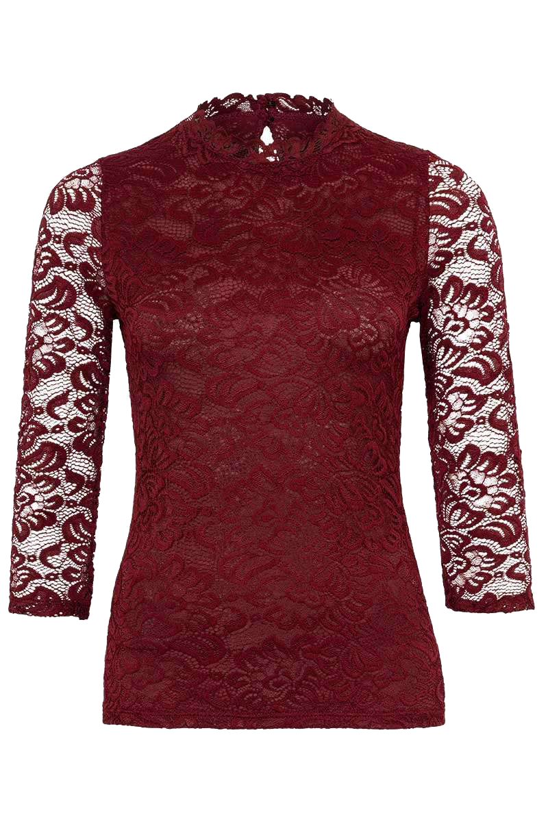 Das beere farbene Damenshirt von My Choice ist rundum aus edler Spitze mit Blütenmuster gefertigt, die am Body mit einem transparenten Futter unterlegt ist. Der hochgeschlossene Rundhalsausschnitt ist ebenfalls mit einem Spitzensaum eingefasst und wird am Rücken mit zwei Knöpfen geschlossen. Die ¾-Ärmel sind 44 cm lang (in Größe 34). Der Schnitt des Shirts ist körpernah gehalten.