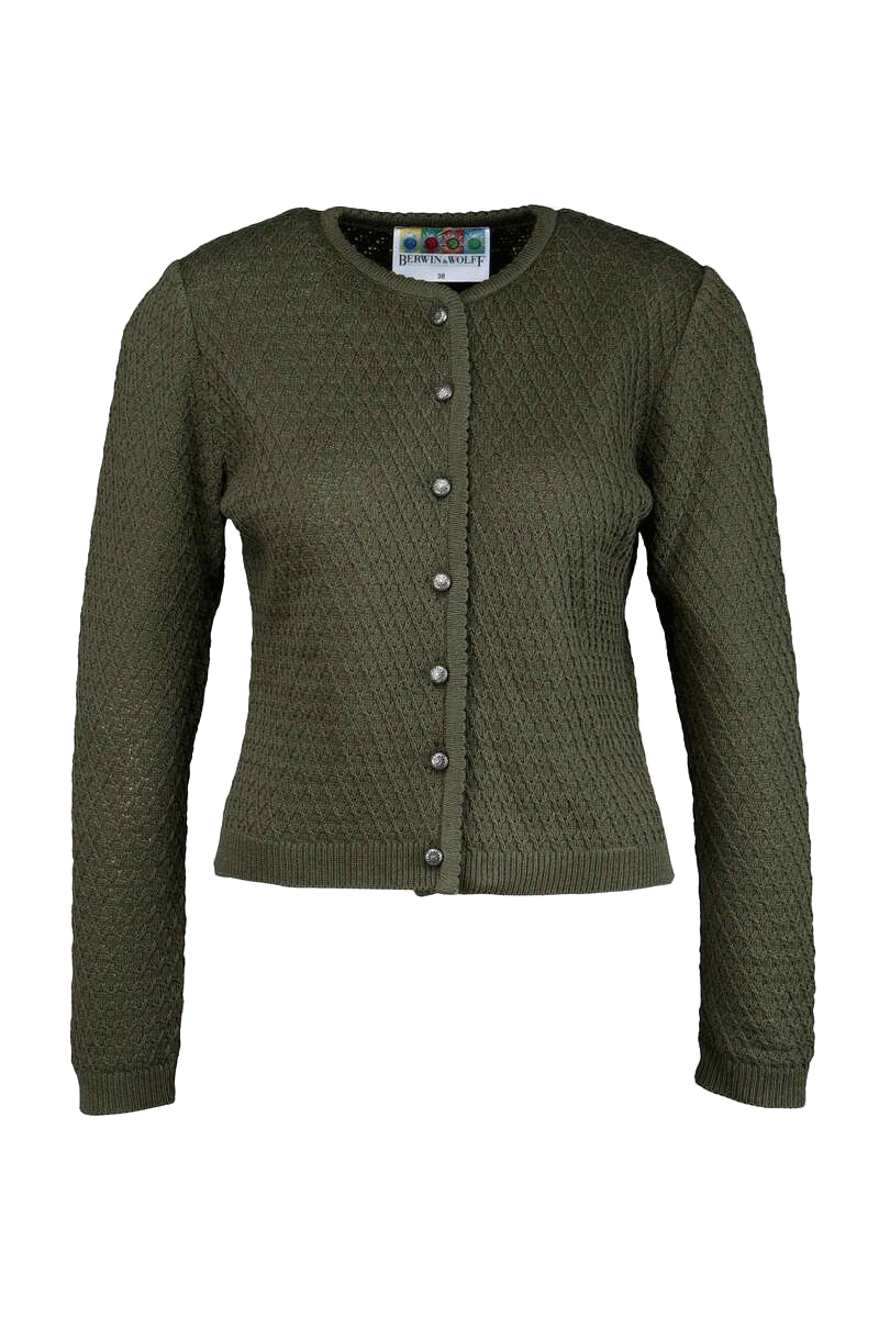 Eine zeitlose, kurz gehaltene Dirndljacke im hübschen Oliv der Marke Berwin & Wolff mit Rundhals-Ausschnitt. Die Strickjacke zeichnet sich durch das hübsche Rautenmuster, das auch auf den Ärmeln und der Rückseite eingearbeitet ist, aus. Die lieblich verzierten Metallknöpfe in Silber runden das Design harmonisch ab. Das Jäckchen ist angenehm zu tragen, da das verarbeitete Material mit Baumwolle weder zu dünn noch zu dick ist. Nicht nur zum Dirndl lässt sich die Strickjacke gut kombinieren, mit einem Rock oder zur Jeans ist sie für den Alltag bestens geeignet.Die Dirndljacke ist im Schnitt gerade und weist in der Größe 36 eine Rückenlänge von 49 cm auf, während die Ärmel ca. 60 cm lang sind. Das Strickgewebe besteht aus 50% Baumwolle und 50% Polyacryl.