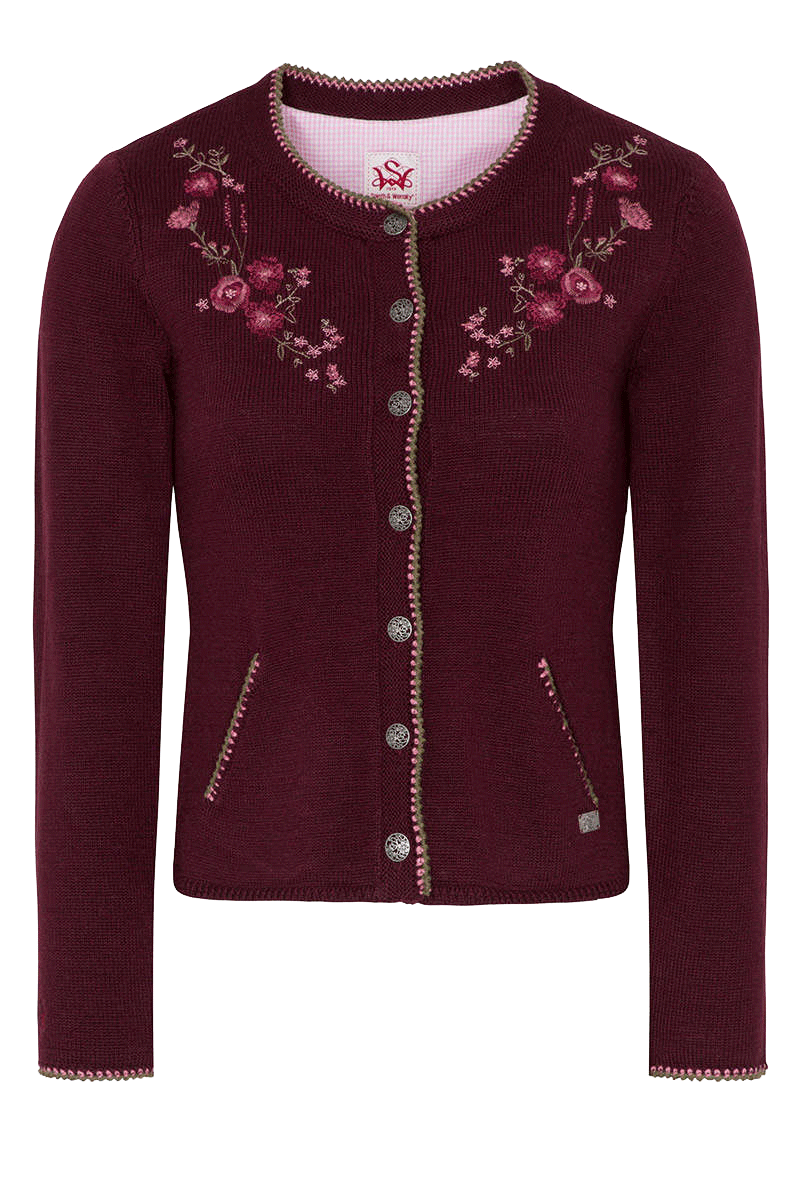 Die weinrote Damenstrickjacke Melone von Spieth & Wensky ist ganz in einem nostalgischen Stil gehalten. Auf dem glatt gestrickten Korpus heben sich die gestickten Blumen dezent hervor. Der Stehkragen, die Knopfleiste und Ärmelabschlüsse sind in Rosa und Grün eingefasst. Die Knopfleiste mit den hübschen Metallknöpfen ist hochgeschlossen bis zum Kragen. Weitere Ausstattungsmerkmale sind das karierte Futter im Kragenbereich und die beiden Einschubtaschen.