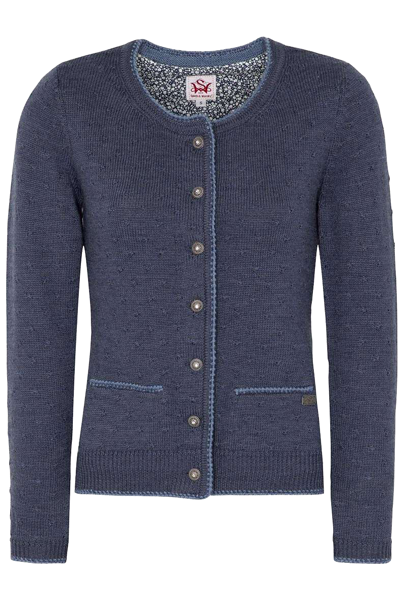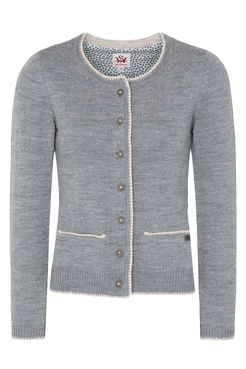 Diese schlichte Damen Strickjacke der Marke Spieth & Wensky in Grau gehört zu den Klassikern der Trachtenmode. Die Abschlüsse der Einschubtaschen und der Abschluss der Ärmel sind rundherum mit einer beigen Ziernaht ausgestattet. Am Rundhalsausschnitt und an den Abschlüsse der Knopfleiste wird diese beige Ziernaht weitergeführt. Der Körper der Jacke und die Ärmel sind in einem filigranen Lochmuster gearbeitet. Am Rücken ist in der Mitte eine zierliche Teilung angedeutet.
