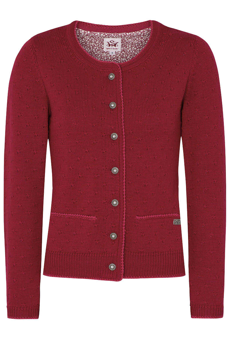 Diese schlichte Damen Strickjacke der Marke Spieth & Wensky in kräftigem Rot gehört zu den Klassikern der Trachtenmode. Die Abschlüsse der Einschubtaschen und der Abschluss der Ärmel sind rundherum mit einer roten Ziernaht ausgestattet. Am Rundhalsausschnitt und an den Abschlüsse der Knopfleiste wird diese rote Ziernaht weitergeführt. Der Körper der Jacke und die Ärmel sind in einem filigranen Lochmuster gearbeitet. Am Rücken ist in der Mitte eine zierliche Teilung angedeutet.