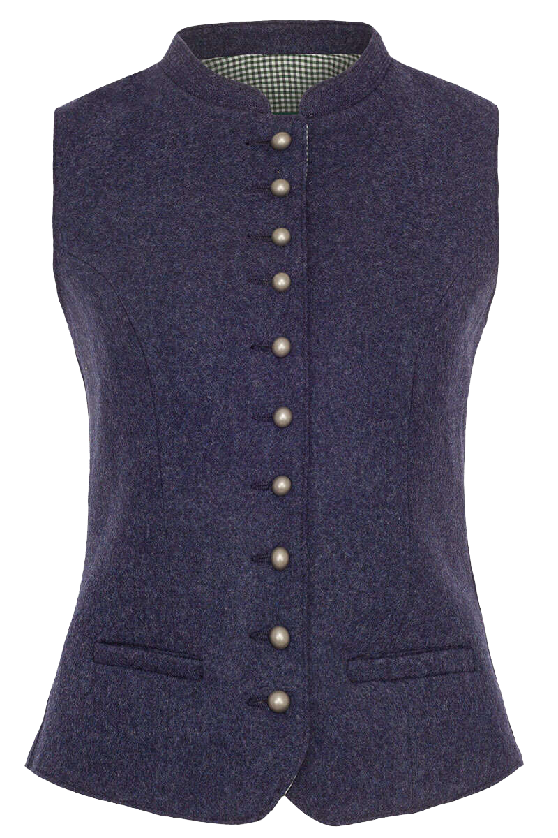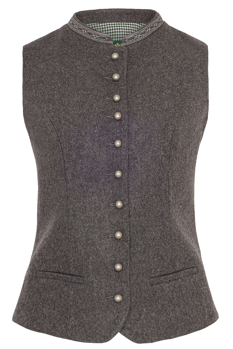 Klassische Elemente wie zwei vordere Einschubtaschen und ein Riegel zur Weitenregulierung im Rücken unterstreichen den authentischen Charakter der Weste. Ein kleiner Stehkragen mit feiner Stickerei sowie dekorative Kugelknöpfe aus Metall verleihen dem Modell eine edle, trachtige Note.