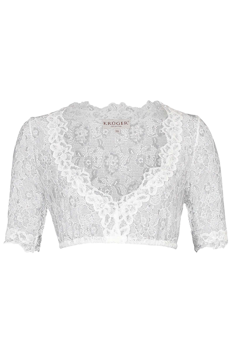 Diese weiße Bluse der Marke Krüger Collection ist aus zarter, elastischer und transparenter Spitze gearbeitet. Die Bluse ist mit einem V-Ausschnitt und halbarm Ärmeln ausgestattet. Rund um den Ausschnitt und am Ärmelabschluss sind Spitzen-Zierstreifen angebracht. Am Saum der Bluse ist ein Gummizug eingearbeitet.
