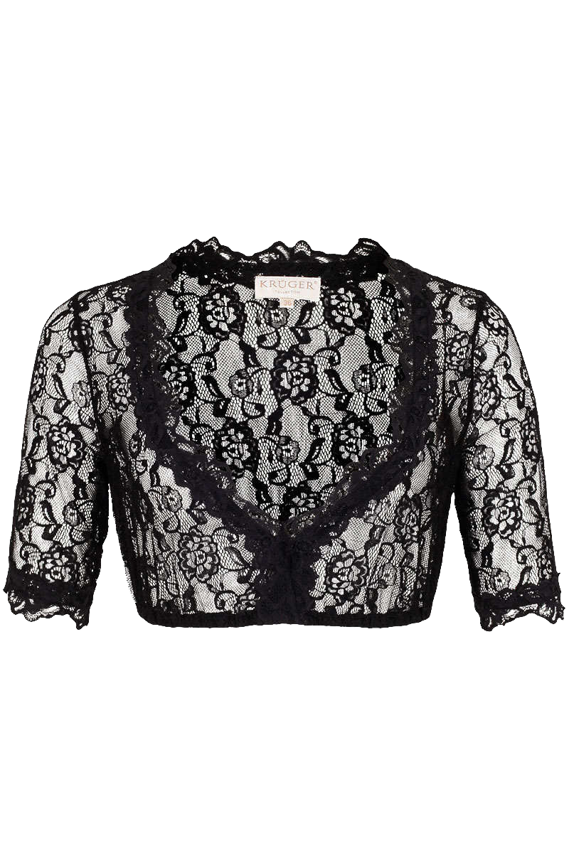 Diese schwarze Bluse der Marke Krüger Collection ist aus zarter, elastischer und transparenter Spitze gearbeitet. Die Bluse ist mit einem V-Ausschnitt und halbarm Ärmeln ausgestattet. Rund um den Ausschnitt und am Ärmelabschluss sind Spitzen-Zierstreifen angebracht. Am Saum der Bluse ist ein Gummizug eingearbeitet.