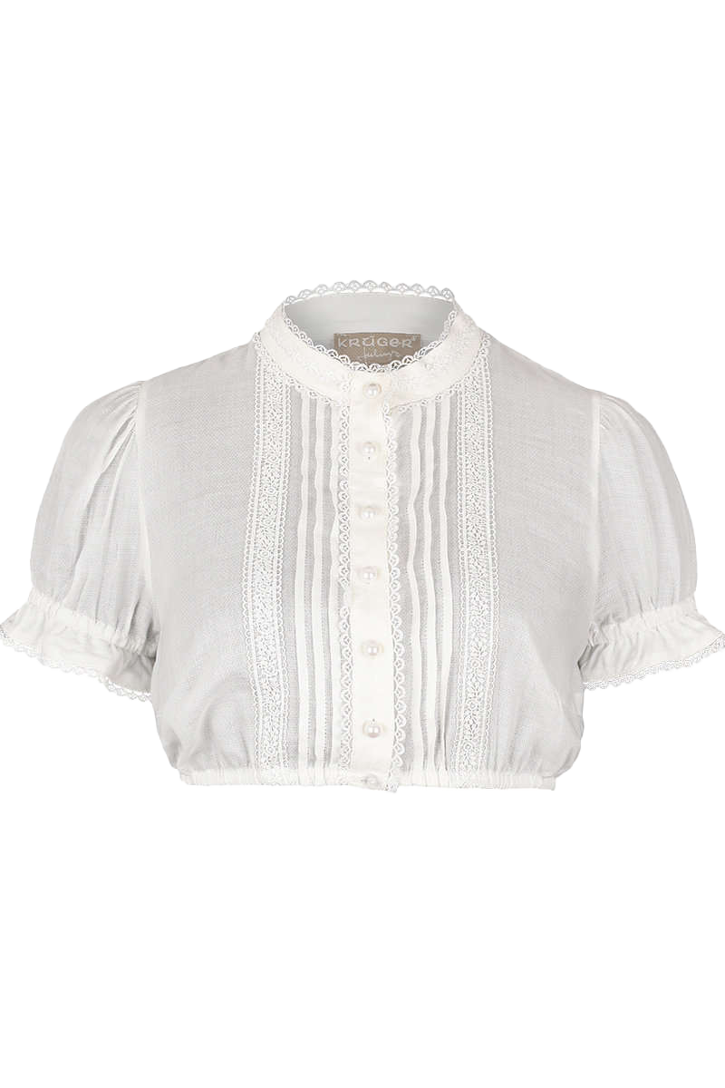 Diese sehr traditionelle Dirndlbluse ist mit einem hochgeschlossenen Stehkragen versehen. Die schlichte Bluse ist links und rechts der Knopfleiste und rund um den Kragen mit einer aufwendigen Spitzenbordüre geziert. Links und rechts der Knopfleiste sind jeweils drei Biesen und jeweils nochmal ein Spitzenstreifen angebracht. Die Ärmelchen sind am Abschluss auch mit einer Spitzenbordüre geziert. Am Saum der Bluse und an den Ärmelsäumen sind Gummizüge angebracht. Die Knopfleiste ist mit kugelförmigen Perlmutt-farbenen Knöpfen versehen.