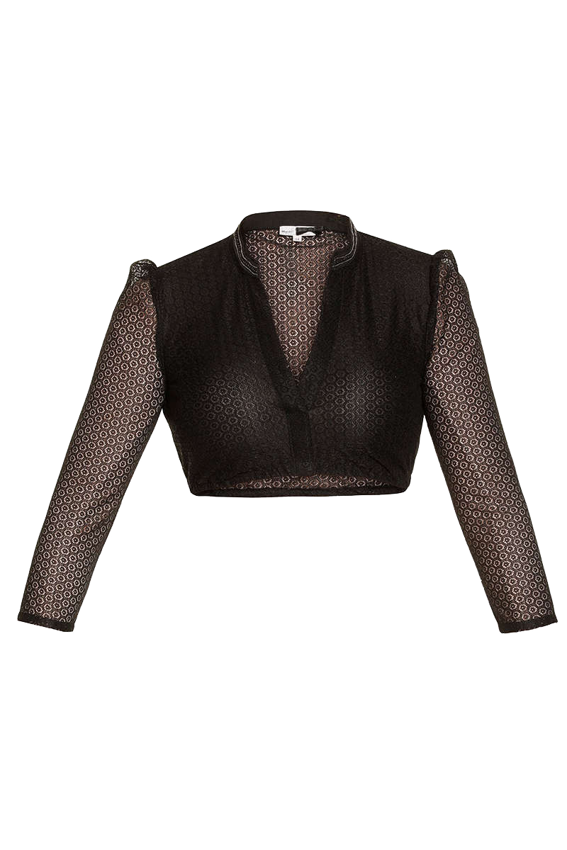 Agatha-Linda ist eine sexy Dirndlbluse aus schwarzer, durchscheinender Spitze. Am Stehkragen hebt sich eine feine Borte aus zwei Silberfäden und einer schwarzen Kugelreihe effektvoll ab. Unterhalb des Kragens ist der Ausschnitt in einem schmalen Schlitz ausgeführt. Die Ärmel sind halblang und gerade geschnitten.