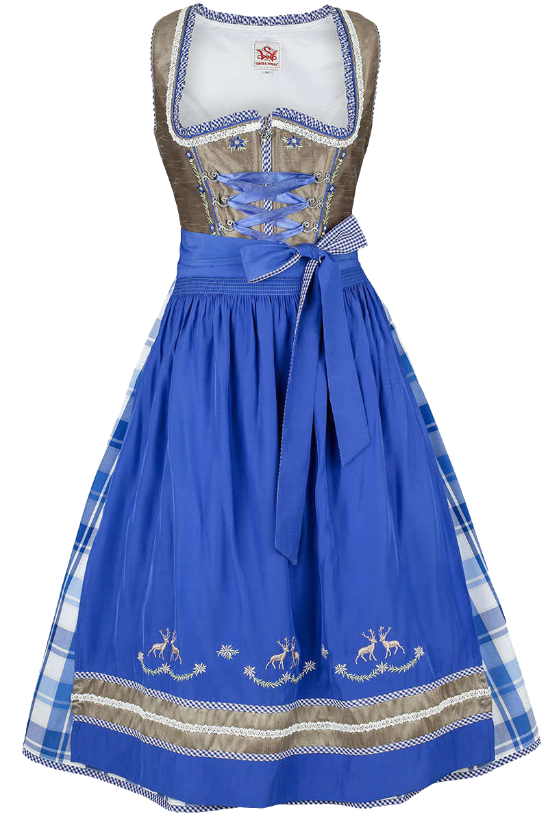Dieses schlichte Dirndl kleidet Sie zu jedem Anlass perfekt und überzeugt durch seine vielen, liebevoll gestalteten Details. Das mittellange Dirndl besteht aus einem karierten Rock und einem Taupe-farbenen, schillernden Oberteil. Der Rock ist schlicht gehalten. Das Oberteil ist dezent verziert: Der Ausschnitt des Dirndls ist mit einer blau-weiß karierten Rüschenbordüre umrandet. Zudem befindet sich am Ausschnitt eine weiße, aufwendig gestaltete Bordüre. Unterhalb des Ausschnittes, links und rechts der Miederhacken ist eine Blumenranke eingestickt. Diese Ranke besteht aus blauen Edelweiß und grünen Blättchen. Auch nahe des Reißverschlusses befindet sich auf jeder Seite ein solches Edelweiß. Die Zierschnürung ist einfarbig gestaltet. Die Miederhacken sind schlicht gearbeitet. Das Dirndl verfügt über eine blaue Schürze, die am unteren Rand mit drei sich gegenüberstehenden Hirschpaaren verziert ist. Unterhalb der Hirsche befindet sich ein breiter Streifen in Taupe, gerahmt wird dieser Streifen von zwei Bordüren weiß-blau kariertem Stoff. In der Mitte des Streifens befindet sich eine weiße Spitzenbordüre. Geschlossen wird das Dirndl vorne mit einem Reißverschluss. Am Zipper befindet sich ein kleiner Hirschkopf. In den Rock sind zwei Einschubtasche eingearbeitet. Der Rock ist ca. 66 cm lang.Vergessen Sie auch nicht einen Dirndl-BH. Denn erst ein spezieller Dirndl-BH unterstützt Ihr Dekolleté vorteilhaft und verschafft dem Dirndl einen guten Sitz. Wir empfehlen hierzu den Dirndl-BH 'Betty'.Dirndl-BH und eine Dirndlbluse sind nicht im Lieferumfang des Dirndls enthalten.
