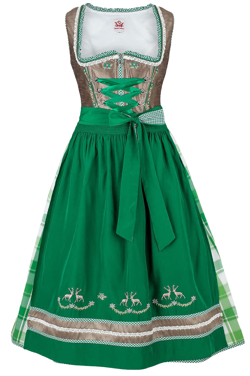 Dieses schlichte Dirndl kleidet Sie zu jedem Anlass perfekt und überzeugt durch seine vielen, liebevoll gestalteten Details. Das mittellange Dirndl besteht aus einem karierten Rock und einem Taupe-farbenen, schillernden Oberteil. Der Rock ist schlicht gehalten. Das Oberteil ist dezent verziert: Der Ausschnitt des Dirndls ist mit einer grün-weiß karierten Rüschenbordüre umrandet. Zudem befindet sich am Ausschnitt eine weiße, aufwendig gestaltete Bordüre. Unterhalb des Ausschnittes, links und rechts der Miederhacken ist eine Blumenranke eingestickt. Diese Ranke besteht aus grünen Edelweiß und hellgrünen Blättchen. Auch nahe des Reißverschlusses befindet sich auf jeder Seite ein solches Edelweiß. Die Zierschnürung ist einfarbig gestaltet. Die Miederhacken sind schlicht gearbeitet. Das Dirndl verfügt über eine grüne Schürze, die am unteren Rand mit drei sich gegenüberstehenden Hirschpaaren verziert ist. Unterhalb der Hirsche befindet sich ein breiter Streifen in Taupe, gerahmt wird dieser Streifen von zwei Bordüren weiß-grün kariertem Stoff. In der Mitte des Streifens befindet sich eine weiße Spitzenbordüre. Geschlossen wird das Dirndl vorne mit einem Reißverschluss. Am Zipper befindet sich ein kleiner Hirschkopf. In den Rock sind zwei Einschubtasche eingearbeitet. Der Rock ist ca. 66 cm lang.Vergessen Sie auch nicht einen Dirndl-BH. Denn erst ein spezieller Dirndl-BH unterstützt Ihr Dekolleté vorteilhaft und verschafft dem Dirndl einen guten Sitz. Wir empfehlen hierzu den Dirndl-BH 'Betty'.Dirndl-BH und eine Dirndlbluse sind nicht im Lieferumfang des Dirndls enthalten.