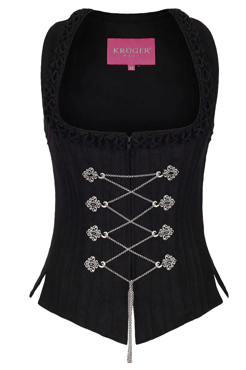 Dieses fesche Mieder ist in Schwarz gehalten und mit zahlreichen Details versehen. Rund herum sind Biesen eingearbeitet. Der Ausschnitt ist rund gearbeitet und mit einer klassischen Froschgoscherlbordüre geziert. Die Miederhaken sind aus Metall gearbeitet und mit schwarzen Glassteinen versehen. IN den Miederhaken verläuft eine Miederkette.