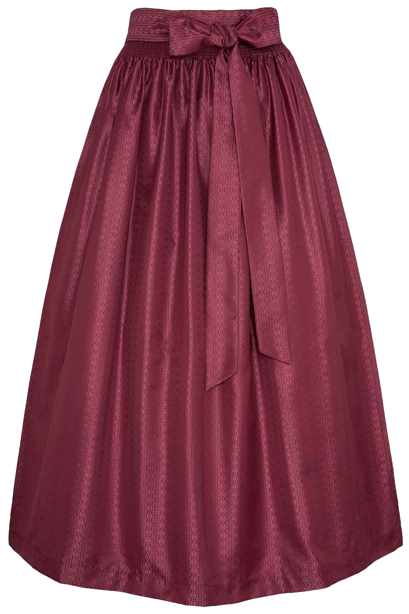 Eine wunderschöne, 90 cm lange Dirndlschürze in schimmerndem Weinrot von Mia san Tracht. Das schlichte Streifenmuster und die klassisch schlichte Ausführung machen sie zu einem perfekten Accessoire für ein Festtagsdirndl. Gehalten wird die Schürze von 5 cm breiten Schürzenbändern. Gefertigt ist die Schürze aus Polyester. Die Schürze kann selbst individuell gekürzt werden.