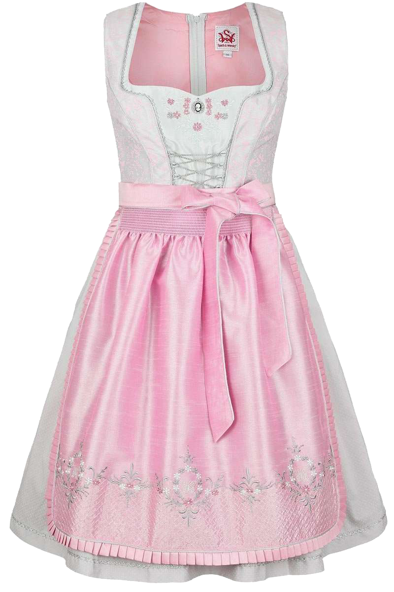 Dieses aufwendig gestaltete Dirndl kleidet Sie zu jedem Anlass perfekt und überzeugt durch seine vielen, liebevoll gestalteten Details. Das kurze Dirndl besteht aus einem zart Rosa-farbenen Rock und einem schillerndem taupe farbenen Oberteil mit Rosa-farbenem floralen Muster mit kleinen Schmetterlingen. Das Oberteil ist in der Mitte mit einem Taupe-farbenen Einsatz versehen. Dieser Einsatz ist mit einer aufwendigen silbernen Stickerei mit Rosa-farbenen Blumen verziert, welche mit Glassteinen besetzt sind. In der Mitte dieser Stickerei befindet sich eine kleine Gemme auf schwarzem Grund. Die Abnäher und die kleine Rüschenbordüre am Ausschnitt, sowie die Zierbordüre am Saum des Rockes sind in Silber gehalten. Die Schnürung ist mit einer Kette versehen. Auch die Schürze des Dirndls ist in zartem Rosa gehalten und mit einer sehr aufwendigen, silbernen Stickerei versehen und mit funkelnden Glassteinen geziert. Außerdem läuft eine Rüschenbordüre rund um die Schürze. Geschlossen wird das Dirndl hinten mit einem Reißverschluss. In den Rock sind zwei Einschubtasche eingearbeitet. Der Rock ist ca. 56 cm lang.Vergessen Sie auch nicht einen Dirndl-BH. Denn erst ein spezieller Dirndl-BH unterstützt Ihr Dekolleté vorteilhaft und verschafft dem Dirndl einen guten Sitz. Wir empfehlen hierzu den Dirndl-BH 'Betty'.Dirndl-BH und eine Dirndlbluse sind nicht im Lieferumfang des Dirndls enthalten.