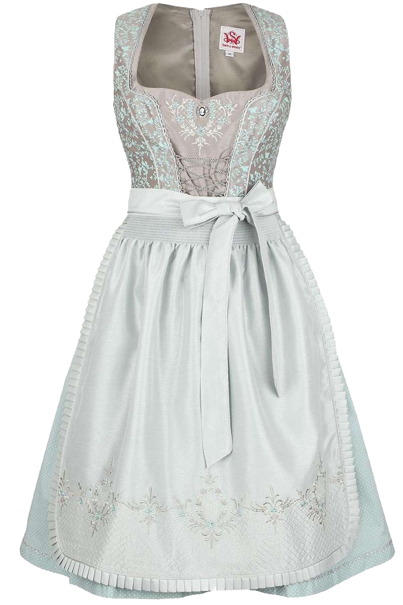 Dieses aufwendig gestaltete Dirndl kleidet Sie zu jedem Anlass perfekt und überzeugt durch seine vielen, liebevoll gestalteten Details. Das kurze Dirndl besteht aus einem zart Mint-farbenen Rock und einem schillerndem taupe farbenen Oberteil mit Mint-farbenem floralen Muster mit kleinen Schmetterlingen. Das Oberteil ist in der Mitte mit einem Taupe-farbenen Einsatz versehen. Dieser Einsatz ist mit einer aufwendigen silbernen Stickerei mit Mint-farbenen Blumen verziert, welche mit Glassteinen besetzt sind. In der Mitte dieser Stickerei befindet sich eine kleine Gemme auf schwarzem Grund. Die Abnäher und die kleine Rüschenbordüre am Ausschnitt, sowie die Zierbordüre am Saum des Rockes sind in Silber gehalten. Die Schnürung ist mit einer Kette versehen. Auch die Schürze des Dirndls ist in zartem Mint gehalten und mit einer sehr aufwendigen, silbernen Stickerei versehen und mit funkelnden Glassteinen geziert. Außerdem läuft eine Rüschenbordüre rund um die Schürze. Geschlossen wird das Dirndl hinten mit einem Reißverschluss. In den Rock sind zwei Einschubtasche eingearbeitet. Der Rock ist ca. 56 cm lang.Vergessen Sie auch nicht einen Dirndl-BH. Denn erst ein spezieller Dirndl-BH unterstützt Ihr Dekolleté vorteilhaft und verschafft dem Dirndl einen guten Sitz. Wir empfehlen hierzu den Dirndl-BH 'Betty'.Dirndl-BH und eine Dirndlbluse sind nicht im Lieferumfang des Dirndls enthalten.