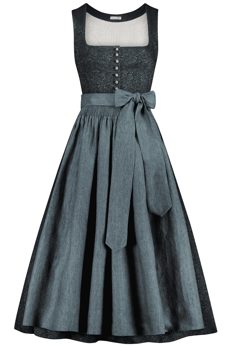 Dieses wunderschöne nachtblaue lange Dirndl der Marke Gottseidank ist aus einem eleganten Jacquard-Oberstoff mit changierendem, eingewebtem Blumenmuster gefertigt und wirkt schon auf den ersten Blick sehr edel. Die traditionell gestalteten, goldfarbenen, halbkugelförmigen Metallknöpfe mit Verzierungen geben diesem Dirndl den letzten Schliff und machen den hochwertigen, eleganten Gesamteindruck perfekt. Zwei verdeckte Eingriffstaschen im Rockteil lassen Sie immer Ihre wichtigsten Dinge verstauen. Das gestreifte Futter des Mieders besteht aus einem Mischgewebe aus weicher, atmungsaktiver Viskose, Baumwolle und Elasthan gefertigt, so dass es auch an heißen Sommertagen angenehm auf der Haut zu tragen ist. Die handgestiftelte, hochwertig verarbeitete Schürze aus 100% Leinen bezaubert durch ihr schlichtes Fischgratdesign, welches farblich sehr harmonisch auf das Dirndl abgestimmt ist und mit dem Sie immer stilvolle Auftritt erleben werden. Das austauschbare Band kann traditionell vorne, hinten oder seitlich als Schleife gebunden werden. Alternativ ist auch eine wunderschöne goldfarbene Metallschließe zu diesem Dirndl gehörig. An den Nähten ist das Dirndl so großzügig genäht, dass es um bis zu 2,5 Größen erweiterbar ist und die 80er Länge (83 cm Rocklänge in Gr. 34) auf bis zu 91 cm verlängerbar ist. Das Dirndl wurde in Europa hergestellt.