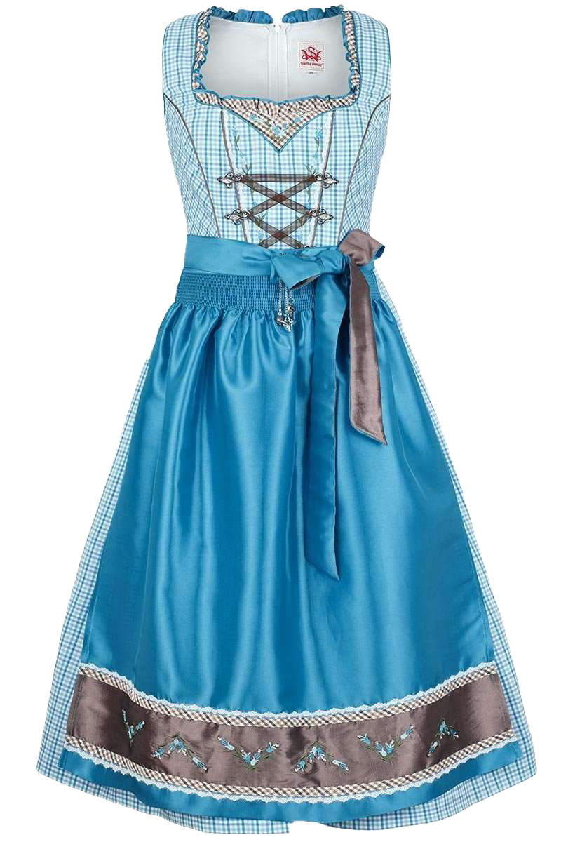 Dieses modische, blau-weiß kleinkarierte Dirndl weist einige liebevolle und aufwendig gestaltete Details auf. Der Ausschnitt ist umrandet von einer braun-weiß karierten Rüschenbordüre. Zudem ist in diese Bordüre in der Mitte zu einem V geformt und mit einer süßen Stickerei aus blauen Blumen und Glassteinen geziert. Die Abnäher des Dirndls sind in Braun gehalten und am Vorderteil mit einer weißen Spitzenbordüre geziert. Hier entlang laufen nochmal blaue, eingestickte Blumen. Die Miederhacken sind aus Metall gearbeitet und mit großen Glassteinen verziert. Die Zierschnürung ist aus zartem braunen Band. Zu dem Dirndl gehört eine dunkel blaue, schillernde Schürze. Am unteren Rand der Schürze sind viele verspielte Details angebracht. So ziert die Schürze ein braunes, schillerndes Zierband, das ebenfalls mit kleinen blauen Blumen bestickt ist und von kleinen Glassteinen geziert wird. Geschlossen wird das Dirndl hinten mit einem Reißverschluss. Die Rocklänge beträgt ca. 67 cm.Wie alle unsere Dirndl, ist auch dieses absolut hochwertig verarbeitet und deshalb nicht nur ein absoluter Hingucker, sondern auch äußerst angenehm zu tragen. Außerdem enthält es auch praktische Details, wie zwei mit Reißverschluss zu verschließende Taschen auf beiden Rockseiten und einen Rückenreißverschluss.Vergessen Sie auch nicht einen Dirndl-BH. Denn erst ein spezieller Dirndl-BH unterstützt Ihr Dekolleté vorteilhaft und verschafft dem Dirndl einen guten Sitz. Wir empfehlen hierzu den Dirndl-BH 'Betty'.Ein Dirndl-BH und eine Dirndlbluse ist nicht im Lieferumfang des Dirndls enthalten.