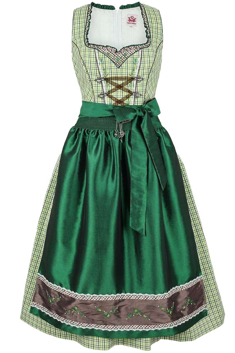 Dieses modische, grün-weiß kleinkarierte Dirndl weist einige liebevolle und aufwendig gestaltete Details auf. Der Ausschnitt ist umrandet von einer braun-weiß karierten Rüschenbordüre. Zudem ist in diese Bordüre in der Mitte zu einem V geformt und mit einer süßen Stickerei aus grünen Blumen und Glassteinen geziert. Die Abnäher des Dirndls sind in Braun gehalten und am Vorderteil mit einer weißen Spitzenbordüre geziert. Hier entlang laufen nochmal grüne, eingestickte Blumen. Die Miederhacken sind aus Metall gearbeitet und mit großen Glassteinen verziert. Die Zierschnürung ist aus zartem braunen Band. Zu dem Dirndl gehört eine dunkel grüne, schillernde Schürze. Am unteren Rand der Schürze sind viele verspielte Details angebracht. So ziert die Schürze ein braunes, schillerndes Zierband, das ebenfalls mit kleinen grünen Blumen bestickt ist und von kleinen Glassteinen geziert wird. Geschlossen wird das Dirndl hinten mit einem Reißverschluss. Die Rocklänge beträgt ca. 67 cm.Wie alle unsere Dirndl, ist auch dieses absolut hochwertig verarbeitet und deshalb nicht nur ein absoluter Hingucker, sondern auch äußerst angenehm zu tragen. Außerdem enthält es auch praktische Details, wie zwei mit Reißverschluss zu verschließende Taschen auf beiden Rockseiten und einen Rückenreißverschluss.Vergessen Sie auch nicht einen Dirndl-BH. Denn erst ein spezieller Dirndl-BH unterstützt Ihr Dekolleté vorteilhaft und verschafft dem Dirndl einen guten Sitz. Wir empfehlen hierzu den Dirndl-BH 'Betty'.Ein Dirndl-BH und eine Dirndlbluse ist nicht im Lieferumfang des Dirndls enthalten.