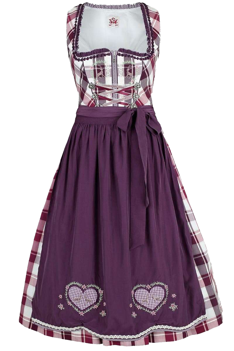 Dieses auffallende Dirndl ist ein absolutes Must-Have. Das mittellange Dirndl besteht aus einem karierten Rock und einem ebenfalls karierten Oberteil. Der Rock ist schlicht gehalten. Das Oberteil ist reichlich verziert: Der Ausschnitt des Dirndls ist mit mehreren aufwendig gestalteten Bordüren umrandet. Diese Bordüren sind einfarbig lila, als auch lila-weiß kariert gehalten. Zudem befinden sich unterhalb des Ausschnittes, links und rechts des Reißverschlusses zwei weiße Spitzenbordüren die sich schön von dem Lila des Dirndls absetzten. Außerdem sind dort zwei kleine Hirsche angebracht die von einer Blumenranken umrandet sind. Die Zierschnürung ist zweifarbig gestaltet. Die Miederhacken sind in verzierten Ornamenten gearbeitet, zudem sind Glassteine in die Hacken eingelassen. Das Dirndl verfügt über eine lilane Schürze, die am unteren Rand mit zwei Herzen versehen ist, in denen jeweils zwei sich gegenüberstehende Hirsche eingestickt sind. Umrandet werden die Herzen von eingestickten Blumenranken die mit Edelweißen versehen sind. Geschlossen wird das Dirndl vorne mit einem Reißverschluss. In den Rock sind zwei Einschubtasche eingearbeitet. Der Rock ist ca. 67 cm lang.Vergessen Sie auch nicht einen Dirndl-BH. Denn erst ein spezieller Dirndl-BH unterstützt Ihr Dekolleté vorteilhaft und verschafft dem Dirndl einen guten Sitz. Wir empfehlen hierzu den Dirndl-BH 'Betty'.Dirndl-BH und eine Dirndlbluse sind nicht im Lieferumfang des Dirndls enthalten.