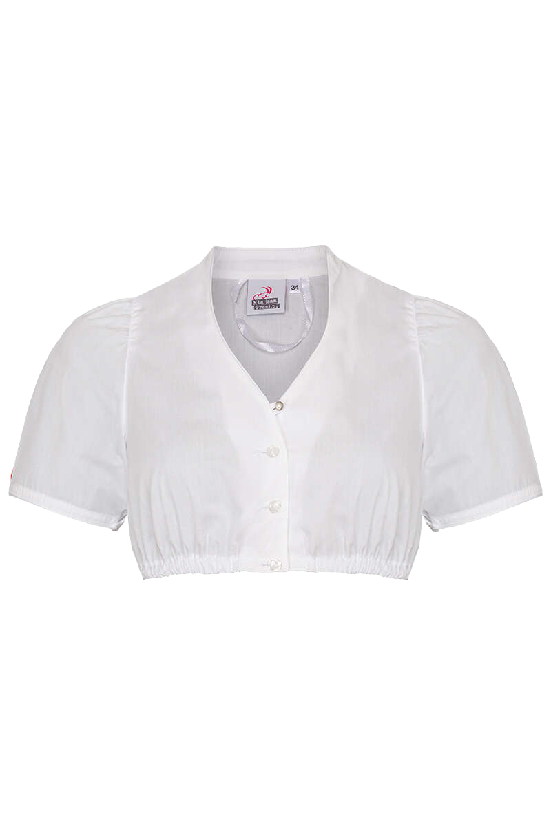 Die Dirndlbluse von Mia san Tracht besticht durch den Schneewittchenkragen, der auch neben den Trägern des Dirndls hervorblitzt und ein besonders schönes Dekolleté zaubert.Das Material dieser Dirndlbluse besteht aus reiner Baumwolle und damit aus einer Naturfaser. Dadurch ist ein sehr angenehmes Tragegefühl garantiert, da das Material sehr atmungsaktiv ist. Daher ist die Bluse auch ideal für heiße Sommertage geeignet.Der tiefe V-Ausschnitt wird mit einem altsilbernen Knopf und perlmuttfarbenen Knöpfen geschlossen. Die Ärmel sind an den Schultern schön in Falten gelegt und liegen locker am Arm an. Auch sie sind mit je einem Knopf versehen. Der Gummizug am Saum sorgt für einen rutschfesten Sitz.