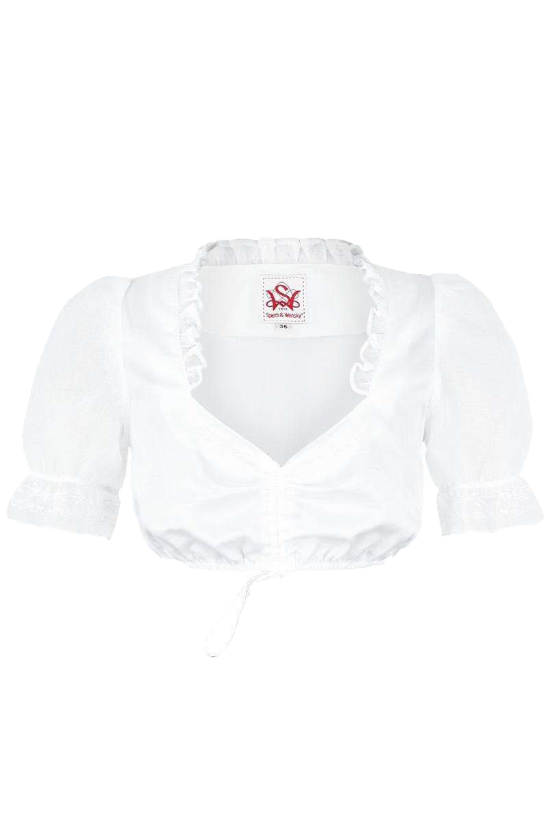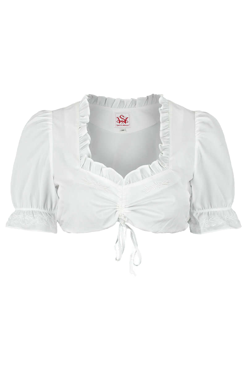 Diese weiße Kurzarm-Bluse lässt sich gut zu nahezu allen Dirndl kombinieren, wozu auch die Raffung auf der Vorderseite beiträgt: dadurch lässt sich der Ausschnitt - je nach Dirndlschnitt, Vorlieben und Anlass - passend verstellen. Der leicht durchsichtige Stoff an den Ärmeln und die durchsichtige Bordüre am Ausschnitt verleihen der Bluse eine zarte Note. Unterhalb des Ausschnitts sind ganz dezent in weiß kleine Blümchen eingestickt. Auch an den Ärmelabschlüssen sind rundherum verspielte Stickereien angebracht.