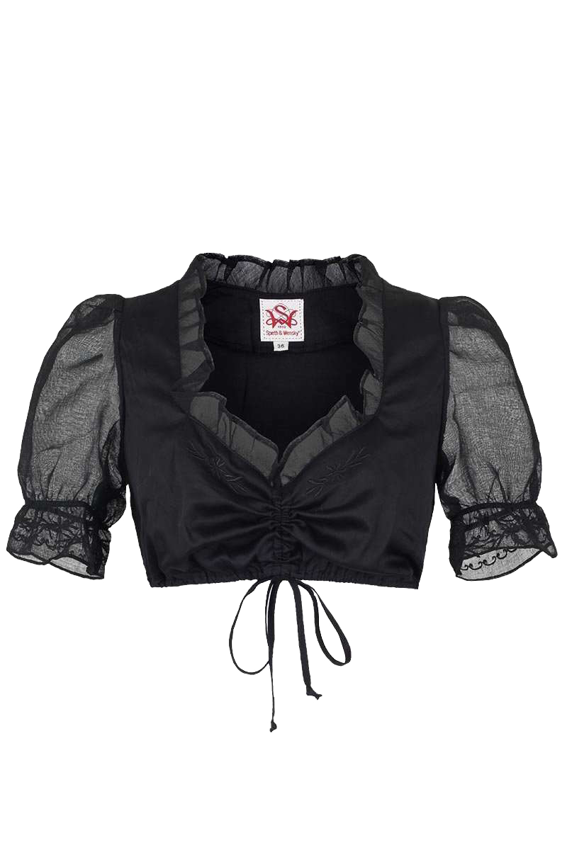 Diese schwarze Kurzarm-Bluse lässt sich gut zu nahezu allen schwarzen Dirndl kombinieren, wozu auch die Raffung auf der Vorderseite beiträgt: dadurch lässt sich der Ausschnitt - je nach Dirndlschnitt, Vorlieben und Anlass - passend verstellen. Der leicht durchsichtige Stoff an den Ärmeln und die durchsichtige Bordüre am Ausschnitt verleihen der Bluse eine zarte Note. Unterhalb des Ausschnitts sind ganz dezent in schwarz kleine Blümchen eingestickt. Auch an den Ärmelabschlüssen sind rundherum verspielte Stickereien angebracht.