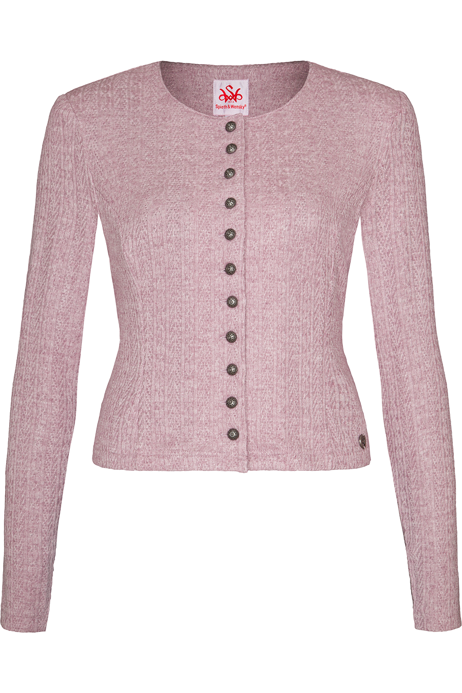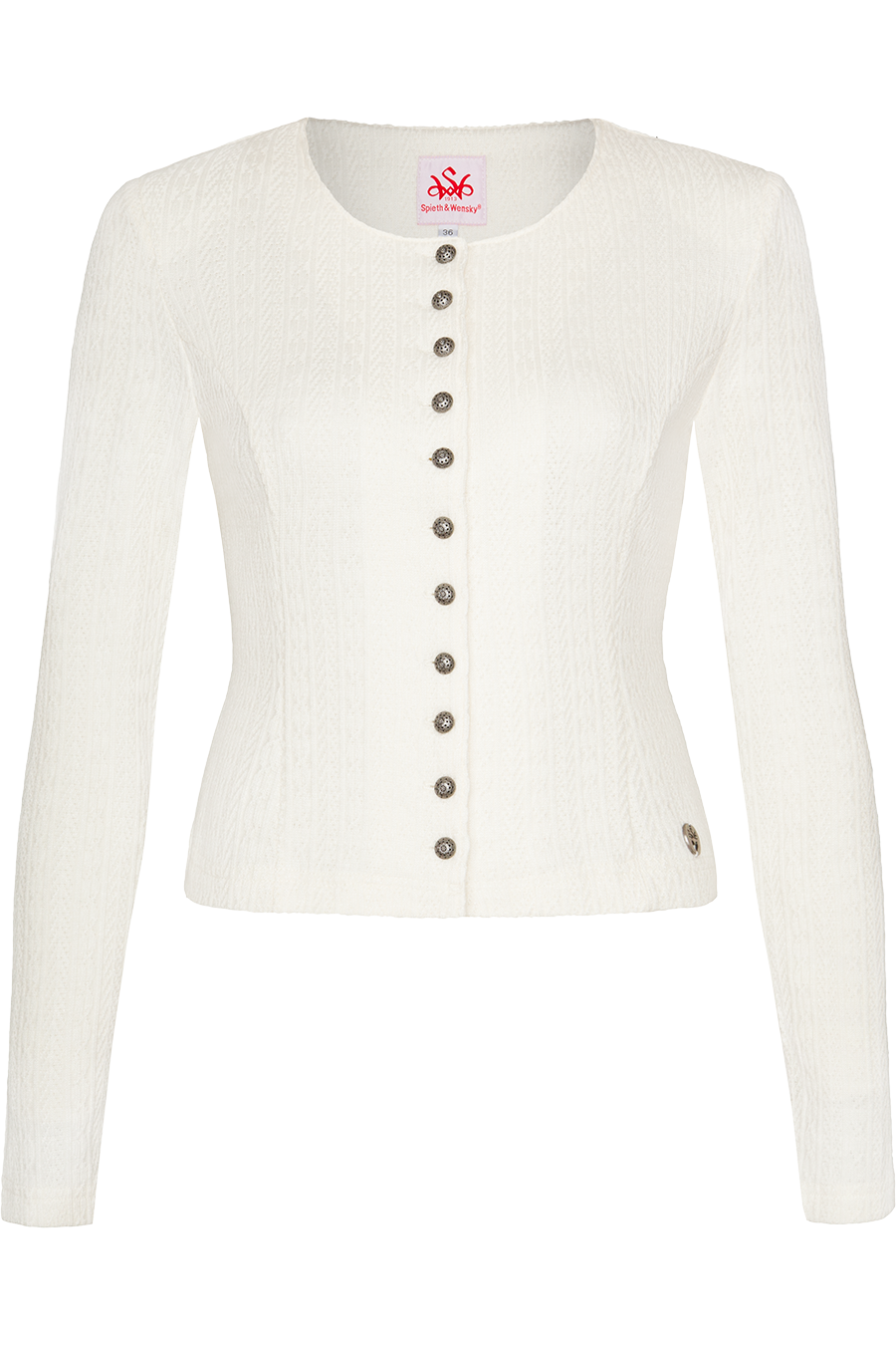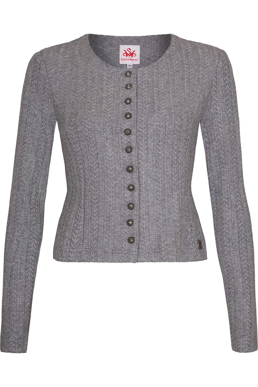 Sie ist gleichmäßig in einem schmalen Zopfmuster gearbeitet. Traditionelle Wiener Nähte sorgen für einen figurbetonten Schnitt. Die Knopfleiste reicht bis zum Rundhalsausschnitt und ist mit runden, altsilberfarbenen Metallknöpfen in Blütenform besetzt.