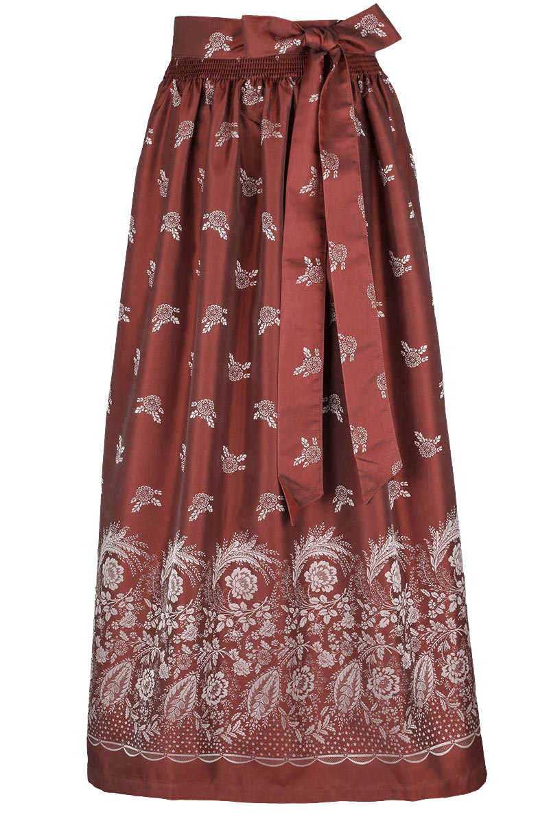 Produktinformationen:Diese auffällige, lange Dirndlschürze ist aus schillerndem Stoff gearbeitet. Die Schürze ist Rot gehalten und wird von einem Blumenmuster geziert das am oberen Rand locker beginnt und sich zum unteren Rand hin verdichtet.
