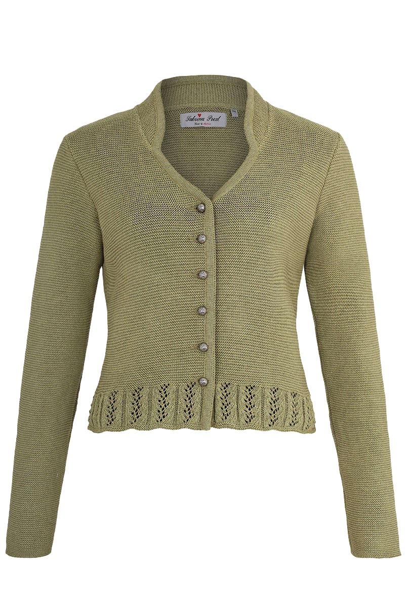 Der Stehkragen mit dem anschließenden Herzausschnitt verleiht der eleganten Damenstrickjacke eine besonders feminine Note. Während die in Oliv gehaltene Jacke weitgehend in einfachem Strickmuster gefertigt ist, bildet der Saum mit Lochmuster einen aparten Kontrast. Ein weiteres dezentes Schmuckelement sind die halbkugeligen Metallknöpfe in Altsilber. Der Schnitt der Jacke ist körpernah und mit kurzer Taille gehalten.