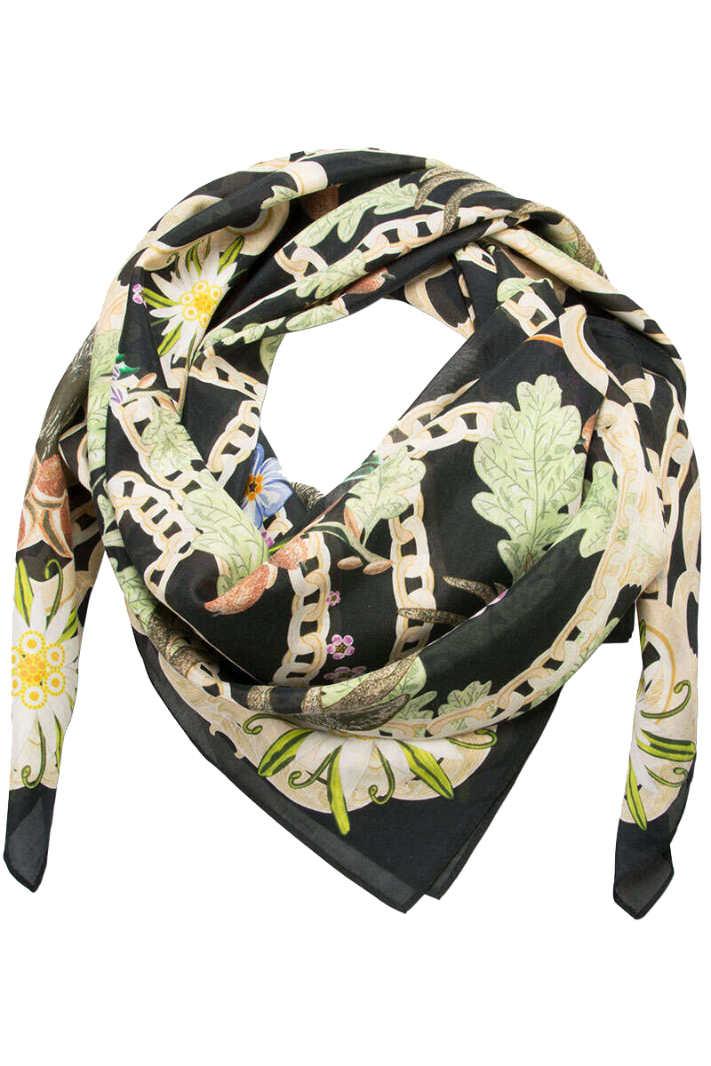 Dieses moderne schwarze Trachtentuch entspricht mit seiner Größe von 1x1 Meter und dem angesagten Retroprint aus Kettenmustern, Hirschköpfen und Blumen dem neuesten Trend. Das elegante Accessoire der Marke Alpenflüstern aus einer fließenden Seide-Baumwoll-Mischung passt sowohl zum Dirndl als auch zur Alltags-Mode.