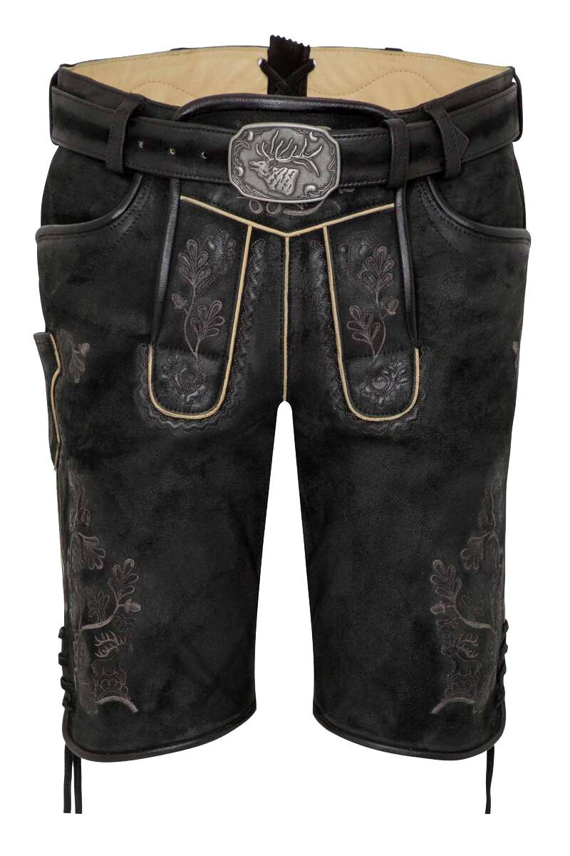 ARCHIBALD WILDBOCK ist eine kurze Trachtenlederhose aus hochwertigem Ziegenveloursleder in schwarz/grau von Spieth&Wensky. Die Lederhose mit Gürtel besticht vor allem durch ihre klassische Eichblattstickerei in echt bayerischer Tradition. Die graue Stickerei ist auf dem Latz, den Beinen, der Messertasche und der Gesäßnaht aufwendig verarbeitet.Die Hose hat einen Latz mit plastischer Stickerei und zwei Knöpfen in Hirschhornoptik.Die Hose wird von einem Gürtel mit schwerer, silberfarbener Hirschkopfschnalle und edler Verzierung gehalten. Die üblichen zwei Einschubtaschen vorne und die Gesäßtasche bieten Platz für allerlei Kleinigkeiten. Die beiden seitlichen Hosenbeinnähte sind ebenfalls mit der Stickerei eingefasst und schließen mit einer schönen Zierschnürung ab. Auf der rechten Seite der Hose befindet sich eine Messertasche. Hinten ist die Hose mit einer Schnürung versehen, mit der die Bundweite verstellt werden kann.Gut zu wissen: Da Leder seit Urzeiten für Trachten verwendet wird, ist jede Hose ein individuelles Unikat. Die Tierhaut, vorzugsweise von Ziegen und Hirschen, hat einzigartige natürliche Vorzüge. Durch ihre atmungsaktive und geschmeidige Beschaffenheit bietet sie höchsten Tragekomfort. Die Echtheit des Naturproduktes LEDER erkennt man an Unebenheiten, Narben und kleinen Kratzern.Typisch für Leder sind auch kleine Farbabweichungen, da jede Haut individuell auf die Färbung reagiert. Auch ein leichter Abrieb ist trotz Fixierung der Farben - vor allem bei dunklen Lederfarben - möglich und stellt keinen Qualitätsmangel dar.Bei der ersten Anprobe sollte darauf geachtet werden, dass die Hose gut sitzt, denn Lederhosen weiten sich um ca. 3-4 cm.Bestellen Sie die Lederhose aber in Ihrer normalen Konfektionsgröße!Wenn die Lederhose einmal nachgegeben hat, kann sie mit Hilfe der Weitenregulierung an der Bundrückseite wieder enger gestellt werden.Auch die Lederhose muss wie ein Lederschuh eingetragen werden. Dann sitzt sie perfekt. Durch die Körperwärme wird das Leder noch geschmeidiger, durch die Spannung passt sich die Hose perfekt an.