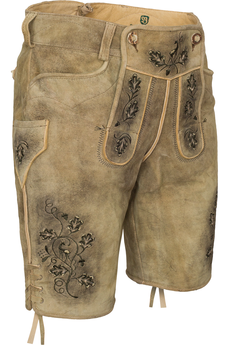 ALBERG von Beckert ist eine hochwertige und traditionell gearbeitete kurze Herren Lederhose aus Wildbock-Leder in der Farbe Inka (hellbraun) im abgewetzten Vintagelook und mit aufwendigen Plattstickereien und Steppnähten. Latz, Messertasche und Beine sind mit aufwendigen und schönen dunkelgrünen Eichenlaub- und Gämsestickereien verziert, die Nähte sind mit hellen Kedern hervorgehoben. Entlang der Hosenbeine verlaufen ebenfalls traditionelle Stickereien. Die kurze Lederhose verfügt über eine Tasche mit Knopfverschluss hinten und zwei Einschubtaschen vorne, sowie eine Messertasche an der rechten Seite. Am Latz und an der Tasche auf der Rückseite sind Hirschhornknöpfe angebracht. Die Hosenbeine sind seitlich geschnürt. Hinten kann die Bundweite durch eine Schnürung, dem traditionellem Zwickel, angepasst werden.Das Material Leder:Da Leder seit Urzeiten für Trachten verwendet wird, ist jede Hose ein individuelles Unikat. Die Tierhaut, vorzugsweise von Ziegen und Hirschen, hat einzigartige natürliche Vorzüge. Durch ihre atmungsaktive und geschmeidige Beschaffenheit bietet sie höchsten Tragekomfort. Die Echtheit des Naturproduktes LEDER erkennt man an Unebenheiten, Narben und kleinen Kratzern.Typisch für Leder sind auch kleine Farbabweichungen, da jede Haut individuell auf die Färbung reagiert. Auch ein leichter Abrieb ist trotz Fixierung der Farben - vor allem bei dunklen Lederfarben - möglich und stellt keinen Qualitätsmangel dar.Bei der ersten Anprobe sollte darauf geachtet werden, dass die Hose gut sitzt, denn Lederhosen weiten sich um ca. 3-4 cm.Bestellen Sie die Lederhose aber in Ihrer normalen Konfektionsgröße!Wenn die Lederhose einmal nachgegeben hat, kann sie mit Hilfe der Weitenregulierung an der Bundrückseite wieder enger gestellt werden.Auch die Lederhose muss wie ein Lederschuh eingetragen werden. Dann sitzt sie perfekt. Durch die Körperwärme wird das Leder noch geschmeidiger, durch die Spannung passt sich die Hose perfekt an.