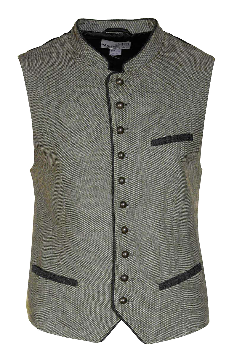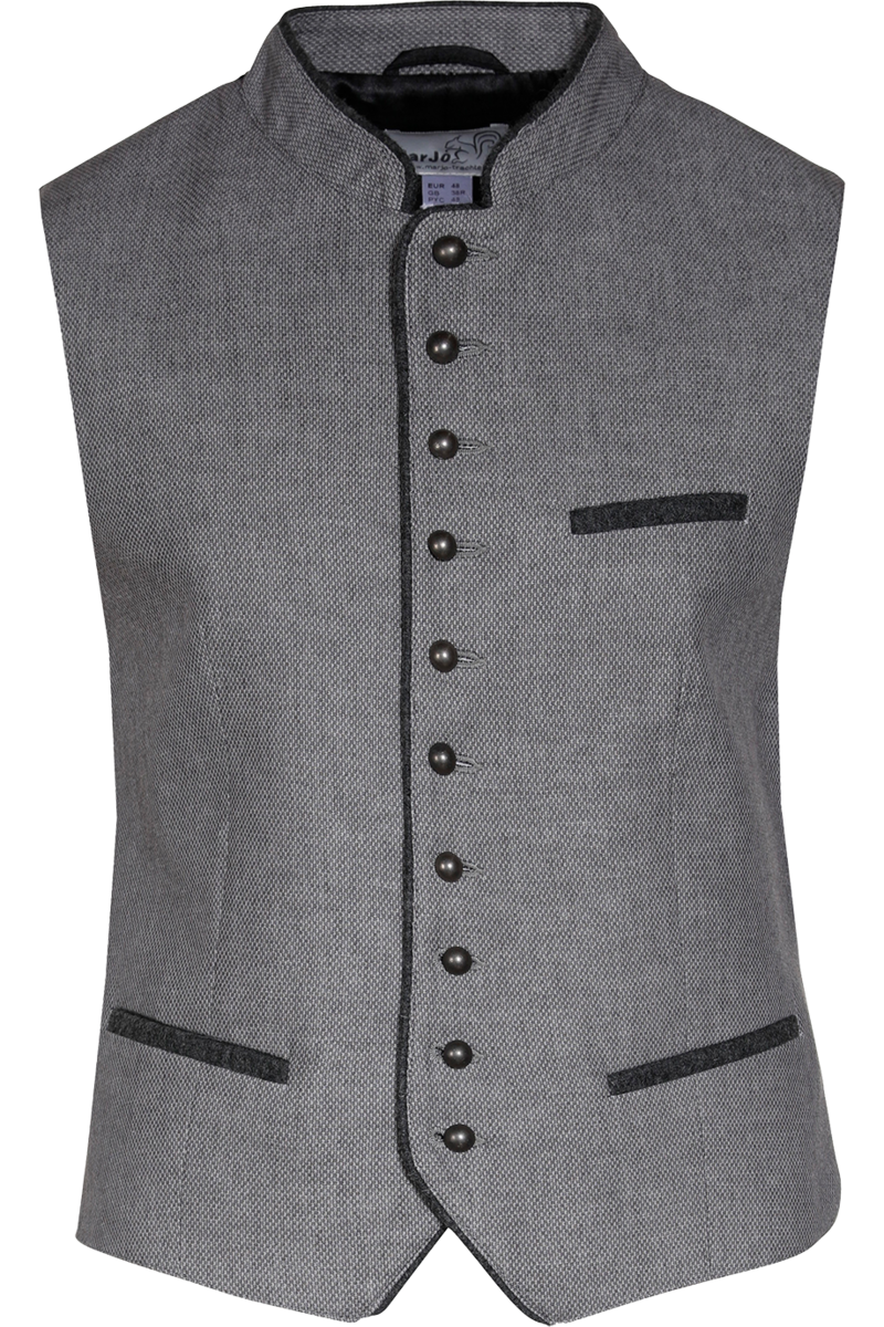 Die Trachtenweste AGAN von MarJo in Anthrazit ist ideal für Einsteiger in die Trachtenmode. Sie überzeugt durch ihren klassischen Schnitt mit Stehkragen und einer durchgehenden Knopfleiste, die bis zum Kragen reicht. Die Vorderseite der Weste ist in einem eleganten Dunkelgrau gehalten, während der Rücken aus schlichtem schwarzem Stoff besteht, was für einen traditionellen Look sorgt.Drei praktische Tascheneinschübe und die Paspelierung an Kragen und Saum setzen dezente Akzente in anthrazitfarbenem Lodenfilz. Die halbkugeligen Metallknöpfe in mattem Dunkelgrau runden das Gesamtbild stilvoll ab. Dank des eingearbeiteten Innenfutters bietet die Weste hohen Tragekomfort, und die Taillenweite kann mit einer Spange am Rücken individuell angepasst werden.Mit einer Rückenlänge von ca. 63 cm in Größe 54 passt diese Weste perfekt für verschiedenste Anlässe und kombiniert Tradition mit einem modernen Touch.