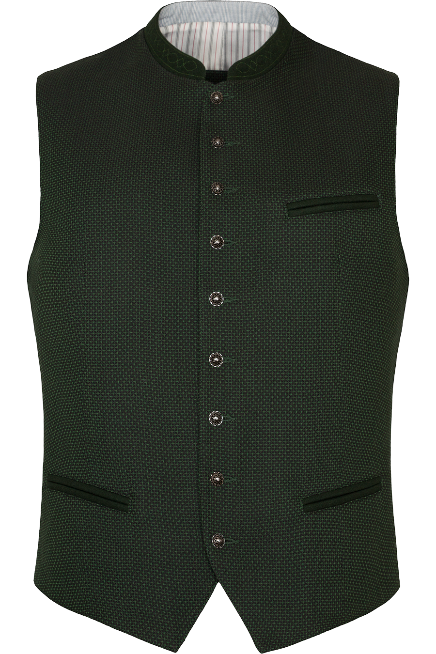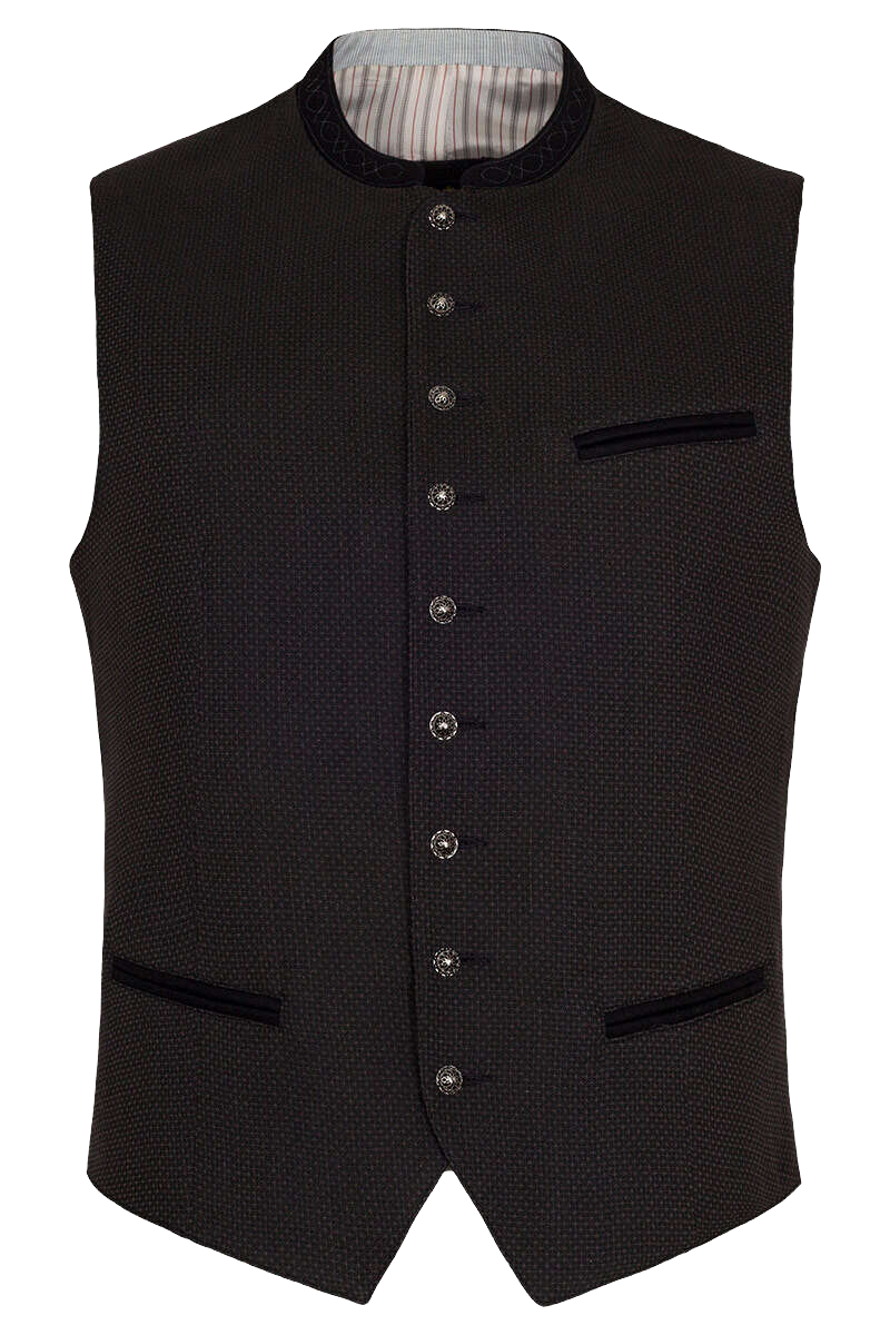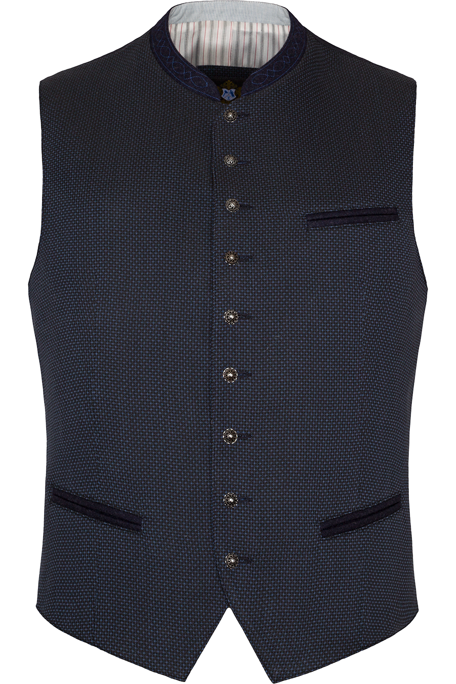 Drei hochwertige Paspeltaschen, halbrunde Metallknöpfe und ein Stehkragen mit dezenter Stickerei verleihen der Weste ihren edlen Charakter. Das gestreifte Innenfutter rundet das Design geschmackvoll ab und sorgt zugleich für zusätzliche Bequemlichkeit.