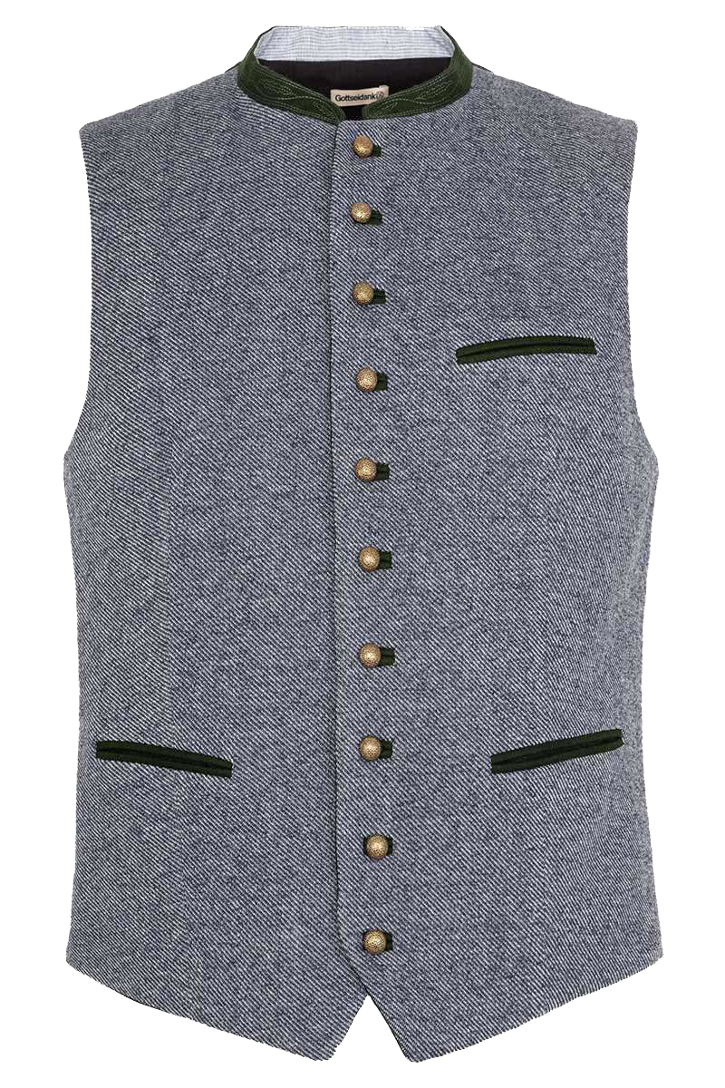 KONSTANTIN von Gottseidank ist eine elegante Trachtenweste in Oxford-Blau. Dazu passend sind die dunkelgrünen Paspel der Taschen, Knopflöcher und der bestickte Stehkragen. Die hoch geschlossene Knopfleiste besteht aus ziselierten halbkugeligen Metallknöpfen. Besonders edel ist auch der Rücken aus mattem, fein gemustertem Material. Schnitt: Slim-fit