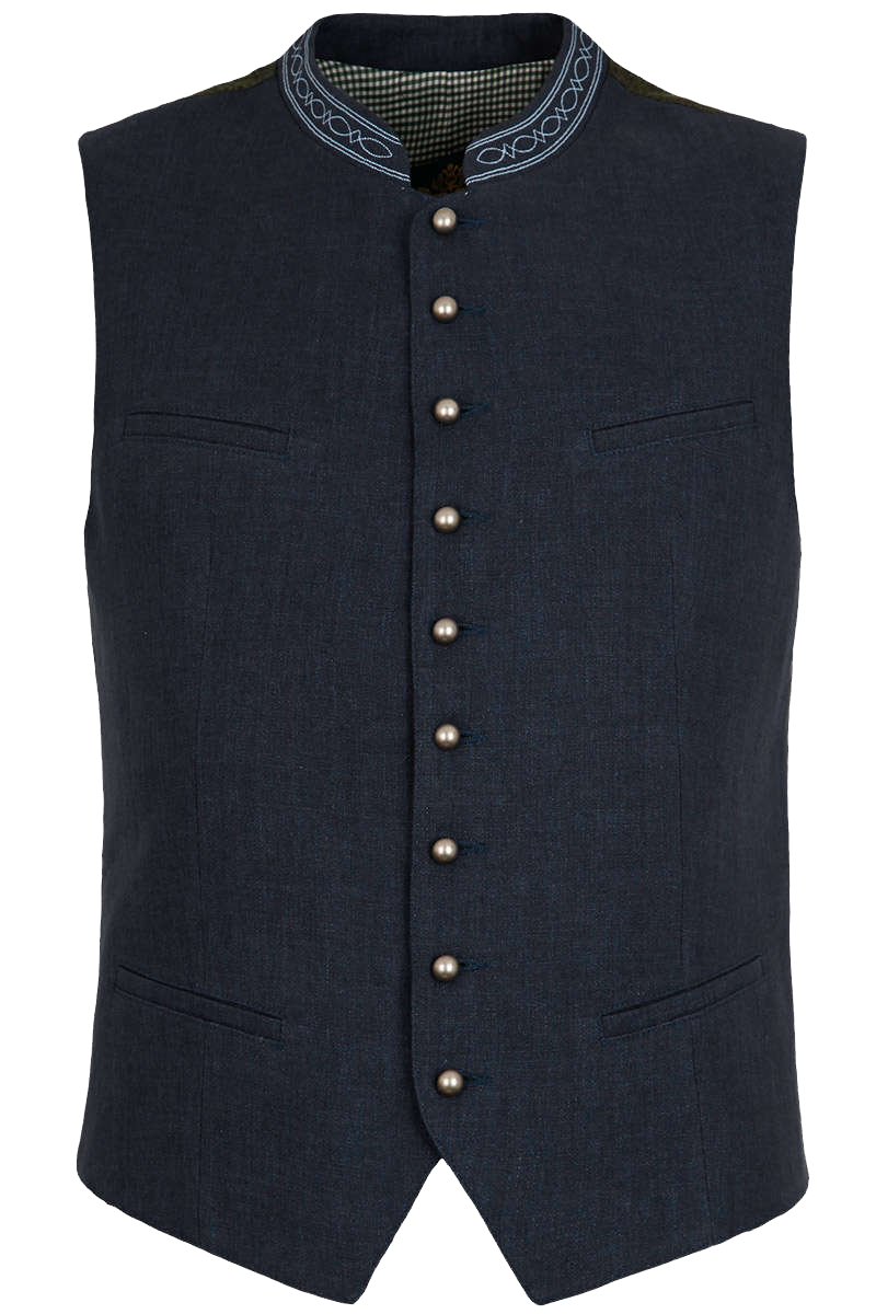 Eine leichte Sommerweste für Herren aus Leinen. Die halbkugeligen Metallknöpfe sind farblich auf die Weste abgestimmt und verstärken den festlichen Charakter ebenso wie der fein gemusterte Rücken. Der Stehkragen ist mit hellen Ziernähten geschmückt, an der Frontseite sind zwei Brust- und zwei Seitentaschen eigearbeitet.