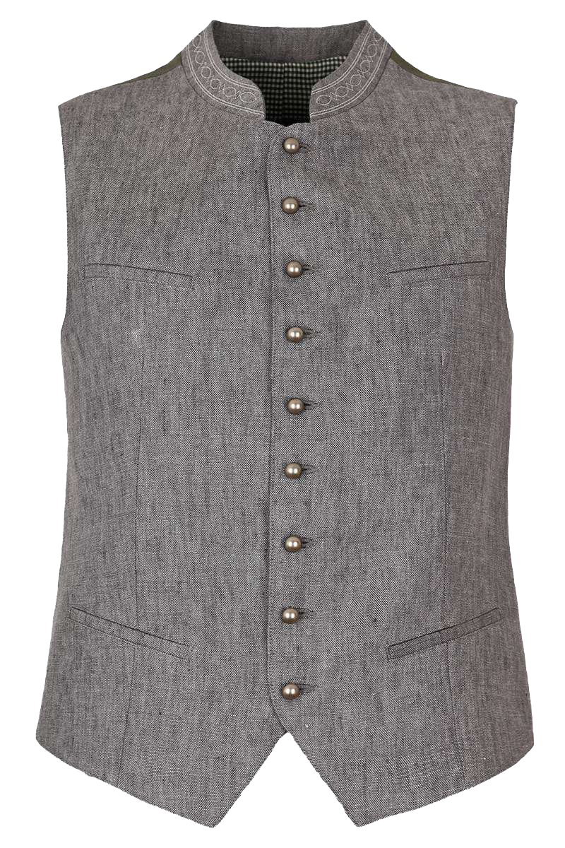 Eine leichte Sommerweste für Herren aus Leinen. Die halbkugeligen Metallknöpfe sind farblich auf die Weste abgestimmt und verstärken den festlichen Charakter ebenso wie der fein gemusterte Rücken. Der Stehkragen ist mit hellen Ziernähten geschmückt, an der Frontseite sind zwei Brust- und zwei Seitentaschen eigearbeitet.