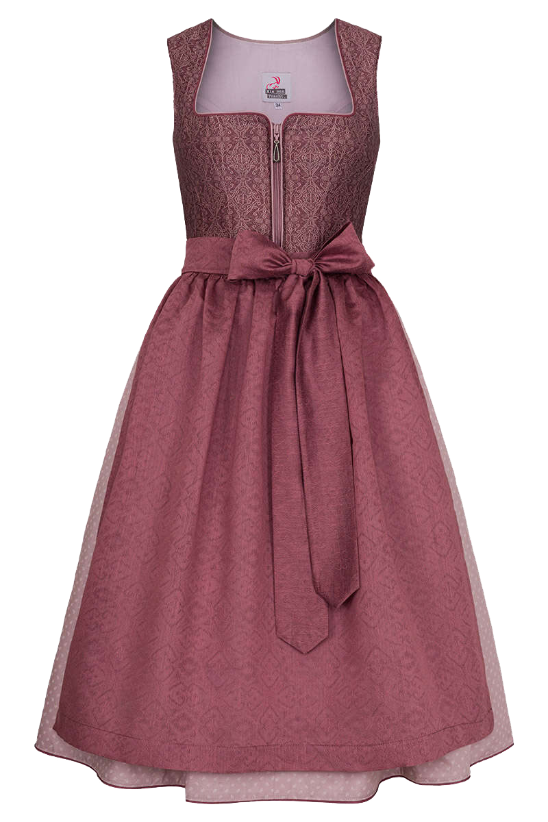 Das Midi-Dirndl von Mia san Tracht in der Farbe Altrosa besticht durch sein romantisches Design und ist die perfekte Wahl für besondere Anlässe. Das gemusterte Oberteil und die harmonische Farbgestaltung machen das Dirndl besonders attraktiv und vereinen Tradition und Moderne.Der angedeutete Herzausschnitt ist mit farblich abgestimmter Paspelierung eingefasst. Geschlossen wird das Dirndl mit einem verdeckten Reißverschluss an der Vorderseite, der mit einem Zipper in Form eines Schmuckstücks in der Farbe Altsilber verziert ist. Die traditionellen Wiener Nähte sorgen für eine schöne, feminine Silhouette.Der Rock aus reiner Baumwolle besticht durch sein traditionelles Blümchenmuster. Die Schürze rundet das Gesamtbild ab: Sie ist mit einem feinen Lochmuster versehen und farblich auf das Oberteil abgestimmt. Das 7 cm breite Schürzenband kann zu einer schönen großen Schleife gebunden werden. Der fein gemusterte Rock hat an jeder Seite eine praktische Tasche, in der die wichtigsten Dinge verstaut werden können.Die Rocklänge in Größe 34 beträgt 70 cm.