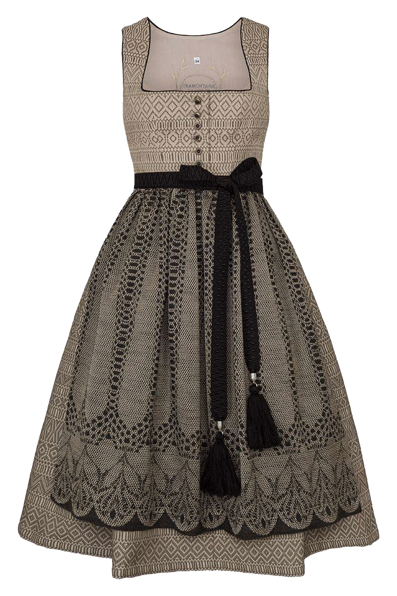 Dieses Dirndl aus der Kollektion Tramontana (Country-Line) ist ein echter Hingucker! Das aufwendige und moderne Design macht das Dirndl einzigartig und zieht alle Blicke auf sich.Das Besondere sind die modernen Muster, die sowohl den Oberstoff des Dirndls als auch die Schürze zieren. Der eckige Ausschnitt und die Armausschnitte sind schwarz eingefasst. Geschlossen wird das Dirndl mit schönen altgoldfarbenen Knöpfen, die mit einem schwarzen Stein verziert sind. Die traditionelle Wiener Naht sorgt für eine feminine Silhouette.Die beige schimmernde Schürze ist mit einem schwarzen Muster verziert, das am Saum wellenförmig ausläuft. Eine Besonderheit ist das schwarze Schurzband: Mit seinem geometrischen Muster und den Quasten am Ende rundet es das Design perfekt ab und verleiht dem Dirndl seinen einzigartigen Charme.Die Rocklänge beträgt in Größe 34 ca. 70 cm.