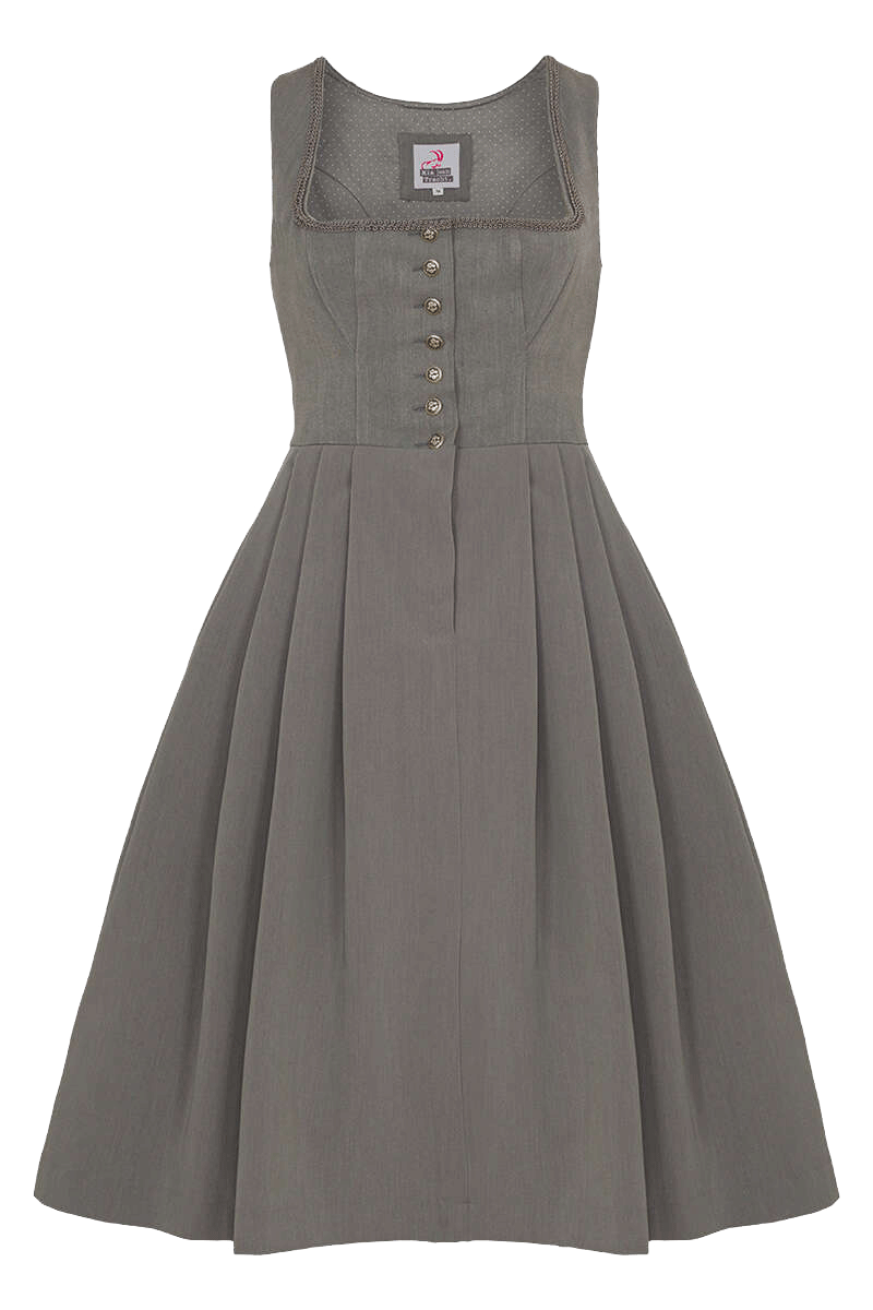 BARBORA ist ein hellgraues Dirndlkleid in betont schlichter Ausführung von Mia san Tracht. Das Mieder besitzt einen tiefen, mit schmaler Borte eingefassten Ausschnitt und ein graues Futter mit weißen Punkten. In die silberfarbenen Metallknöpfe sind kleine Blüten eingeprägt. Der 70 cm lange Rock besitzt eine Tasche rechts. Gefertigt ist das Kleid aus einem Gewebe mit 78 % Polyester, 18 % Viskose und 4 % Elasthan. In seiner schlichten Ausführung eignet es sich besonders gut als Basic für den Einsatz in Gastronomie, Hotellerie und als Vereinskleidung.