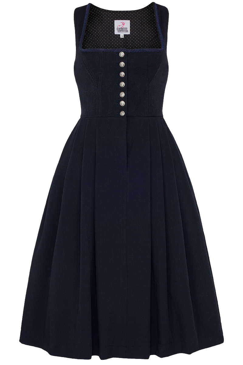 BARBORA ist ein marineblaues Dirndlkleid in betont schlichter Ausführung von Mia san Tracht. Das Mieder besitzt einen tiefen, mit schmaler Borte eingefassten Ausschnitt und ein dunkelblaues Futter mit weißen Punkten. In die silberfarbenen Metallknöpfe sind kleine Blüten eingeprägt. Der 70 cm lange Rock besitzt eine Tasche rechts. Gefertigt ist das Kleid aus einem Gewebe mit 78 % Polyester, 18 % Viskose und 4 % Elasthan. In seiner schlichten Ausführung eignet es sich besonders gut als Basic für den Einsatz in Gastronomie, Hotellerie und als Vereinskleidung.