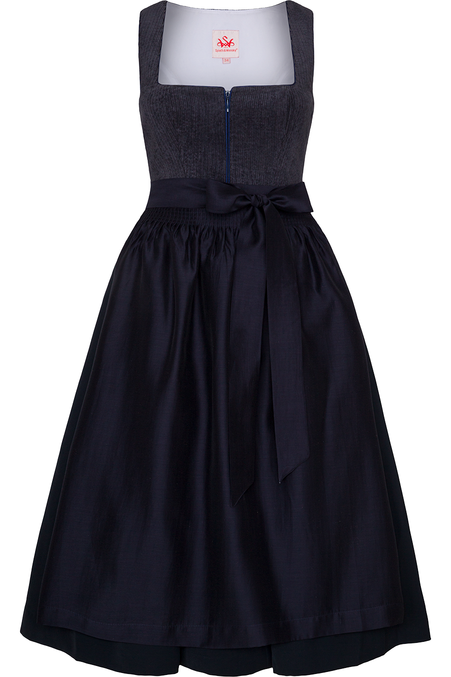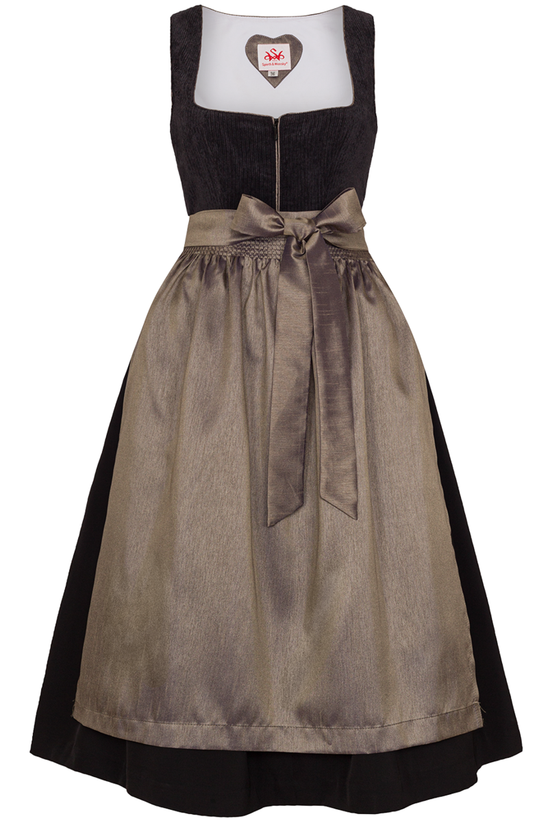 Das Mididirndl DASING von Spieth&Wensky in der Farbe schwarz mit hellbraunen Akzenten besticht durch sein schlichtes, modernes Design mit edlem Cordoberteil. Eine Besonderheit ist das Oberteil aus feinem Cord. Der gerade Ausschnitt ist mit einer glänzenden Borte verziert. Das Dirndl wird vorne mit einem verdeckten Reißverschluss geschlossen. Die traditionellen Wiener Nähte sorgen für eine schöne, feminine Silhouette. Sowohl Dirndlblusen aus Spitze als auch schlichte, klassische Blusen aus Baumwolle lassen sich wunderbar zu diesem Dirndl kombinieren.Der Rock ist rundum in Falten gelegt und hat auf der rechten Seite eine praktische Einschubtasche mit Reißverschluss.Die einfarbige, schimmernde Schürze in melierter Optik rundet das Gesamtbild ab.Das Dirndl hat in Größe 36 die moderne Rocklänge von 70 cm.