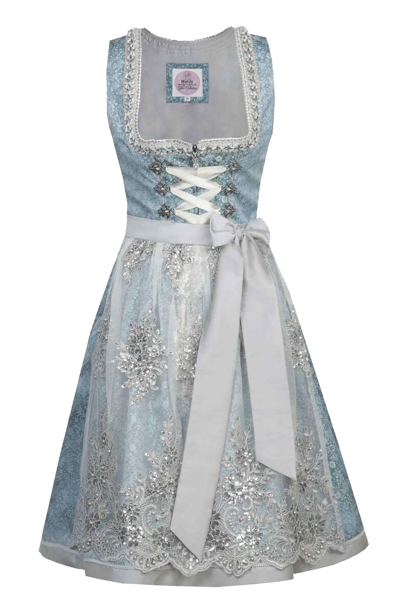 JULE von MarJo ist ein bezauberndes Mini-Dirndl, das durch die frische Farbkombination Blau und Champagner besonders elegant wirkt.Oberteil und Rock sind mit einem romantischen Blumenmuster verziert, der gerade Ausschnitt ist mit Borte und Rüschen eingefasst. Die Metallösen der Schnürung sind mit Glitzersteinchen besetzt.Das Highlight des Dirndls ist die transparente Schürze. Sie ist mit schimmernden Blüten bestickt, die durch champagnerfarbene Perlen hervorgehoben werden. Kleine Pailletten veredeln die Schürze zusätzlich. Der Saum läuft wellenförmig aus und wirkt durch den Perlenbesatz besonders hübsch. Als Schürzenband dient ein edles schimmerndes Band aus Satin. Der Rocksaum ist mit einer hübschen Borte geschmückt.Auf beiden Seiten der Schürze befinden sich praktische Innentaschen, die zusätzlich mit einem Reißverschluss verschlossen werden können.Die Rocklänge beträgt bei Konfektionsgröße 34 ca. 50 cm.