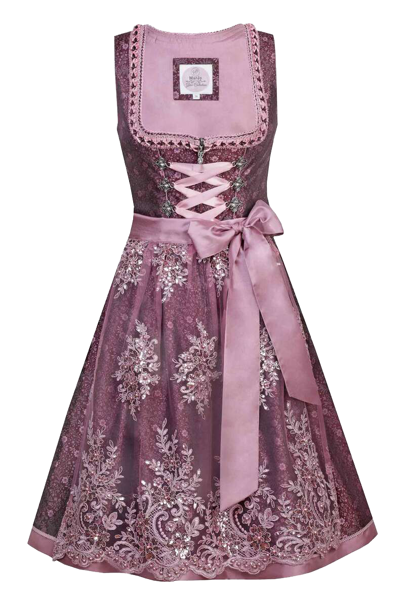 JULE von MarJo ist ein bezauberndes Mini-Dirndl, das durch die Farbkombination Beere und Rosa besonders elegant wirkt. Oberteil und Rock sind mit einem romantischen Blumenmuster verziert, der gerade Ausschnitt ist mit Borte und Rüschen eingefasst. Die Metallösen der Schnürung sind mit Glitzersteinchen besetzt. Besonderes Highlight dieses Dirndls ist die Dirndlschürze aus transparenter Spitze, die mit Blumen bestickt und mit zarten Pailletten verziert ist. Als Schürzenband dient ein schimmerndes Band aus Satin.Auf beiden Seiten der Schürze befinden sich praktische Innentaschen, die zusätzlich mit einem Reißverschluss verschlossen werden können.Die Rocklänge beträgt bei Konfektionsgröße 36 ca. 50 cm.
