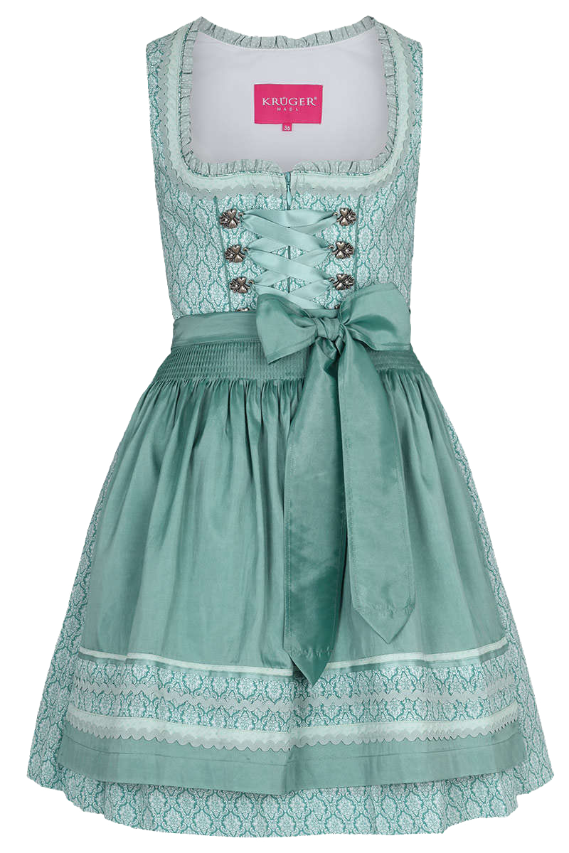 Das in Türkis gehaltene Dirndl mit 50 cm Mini-Rocklänge steht für pure Lebensfreude. Der tiefe Ausschnitt ist mehrreihig mit Rüschen und Borten eingerahmt. Die Haken der Miederschnürung aus Metall sind mit Glitzersteinen besetzt. Das Dirndlkleid mit zwei Einschubtaschen ist mit einem Druckmuster in Weiß/Türkis gehalten, auf dem sich die unifarbene türkisen Schürze effektvoll abhebt.