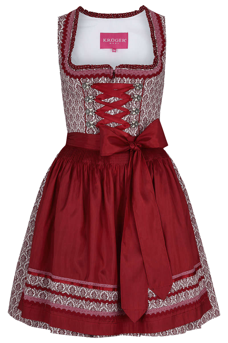 Das in Weinrot gehaltene Dirndl mit 50 cm Mini-Rocklänge steht für pure Lebensfreude. Der tiefe Ausschnitt ist mehrreihig mit Rüschen und Borten eingerahmt. Die Haken der Miederschnürung aus Metall sind mit Glitzersteinen besetzt. Das Dirndlkleid mit zwei Einschubtaschen ist mit einem Druckmuster in Weiß/Rot gehalten, auf dem sich die unifarbene rote Schürze effektvoll abhebt.