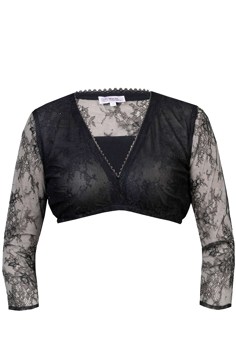 KOSIMA-DORO ist eine edle Dirndlbluse aus feiner transparenter Spitze mit floralem Muster und Strasssteinchen in schwarz.Sie besitzt einen V-Ausschnitt und die 3/4-langen Ärmel sind gerade geschnitten.