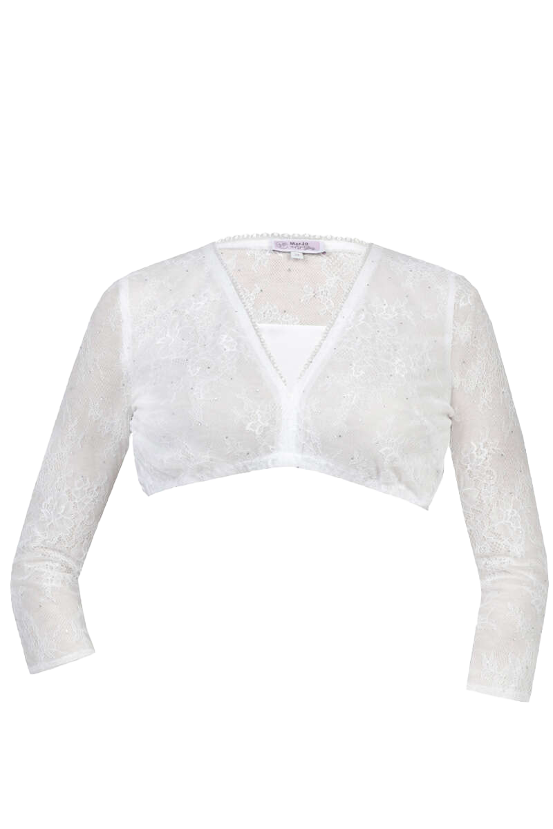 KOSIMA-DORO ist eine verspielte Dirndlbluse aus feiner transparenter Spitze mit floralem Muster und Strasssteinchen in offwhite.Sie besitzt einen V-Ausschnitt und die 3/4-langen Ärmel sind gerade geschnitten.